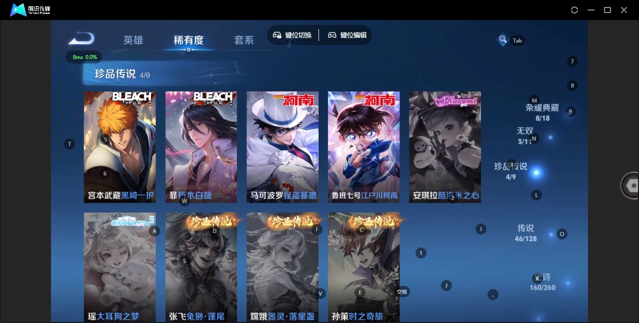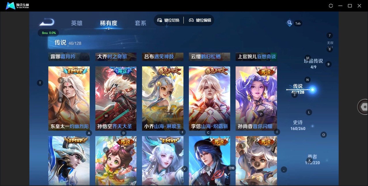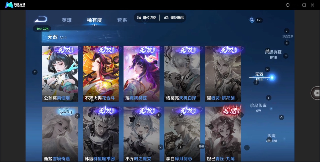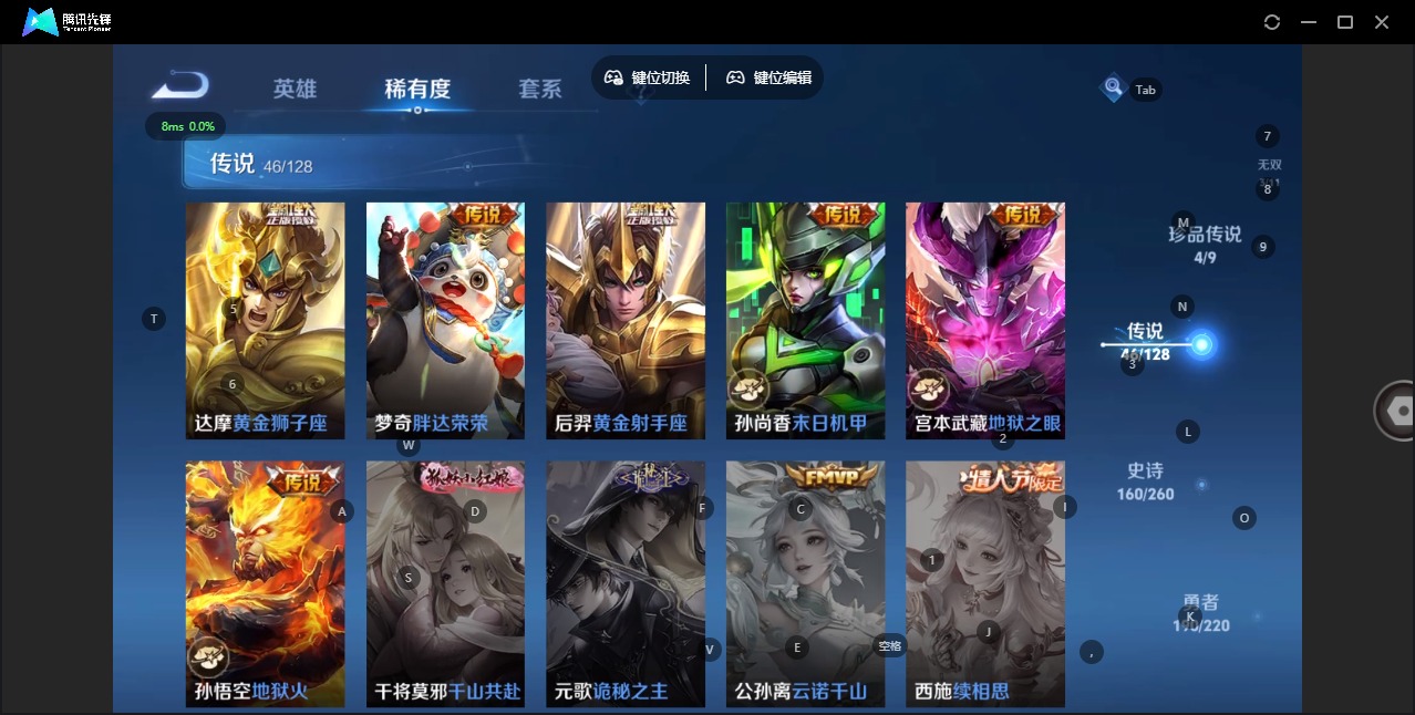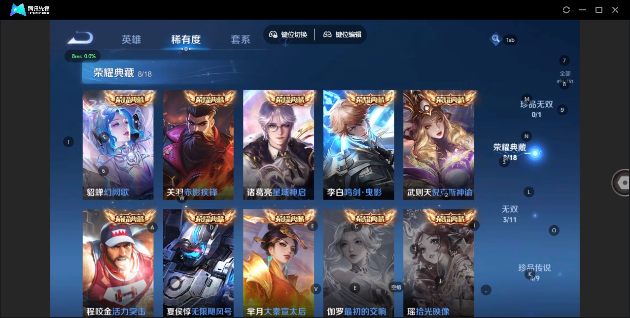 - [11252021]V8 1典藏 1无双 3珍品传说 21传说 123英雄 264皮肤 可修改实名 荣耀水晶:鸣剑·曳影 无双皮:碎月剑心(李白无双) 珍品传说:怪盗基德,朽木白哉,黑崎一护 传说皮:琥珀纪元马超,落雪白狼,幻光神枪,祥瑞亨通,地狱之眼,末日机甲-孙尚香(绿蚂蚱),一念神魔,淬星耀世,云鹰飞将(小将军),无双飞将,电玩·雷克斯,妄想实况,鹤归松栖(云缨),澜逐花归海 珍宝阁皮:蔷薇恋人,女武神 限定皮:愿照·九州拓(澜年限),逐霄战戟,鸣野蒿,神威(电光马子),高山流水,怒海麟威,五谷丰年,武圣,祈雪灵祝(雪兔子),李小龙,寅虎·赤拳(老虎年限) 史诗皮:星界战将,谪仙醉月,鸭鸭历险记-刘禅,龙之律动,石田雨龙,百相守梦-百里守约,蔬乡物语(鲁班七号),超元猎域,琥珀纪元伽罗,百相守梦-周瑜,化蝶舞,破空之剑,紫霞仙子,特工魅影,千年之狐,鹤归松栖(赵怀真),江河有灵,高渐离燃音魔法,雪夜绮愿(周瑜),百解令(蒙犽),蒙恬荣光圣徽,冰冠公主,偶像歌手,晚萤,电玩·爆裂旋风,末日机甲-吕布,猫狗日记-大乔,节奏热浪,女仆咖啡,摇滚巨星,水果甜心,绅士熊喵,天才门将,星夜王子,心灵骇客,德古拉伯爵,暗隐猎兽者,幽灵船长,鬼剑武藏,心灵战警,乐园奇幻夜,舞动绿茵,地狱岩魂,拒霜思,缤纷独角兽,乘风破浪,逐浪之夏,月团寄思,水晶猎龙者,曙光守护者,金属风暴,原初追逐者,圣诞狂欢,圣诞恋歌,鹰眼统帅,魅力维加斯,黎明之约,赏金猎手,无心