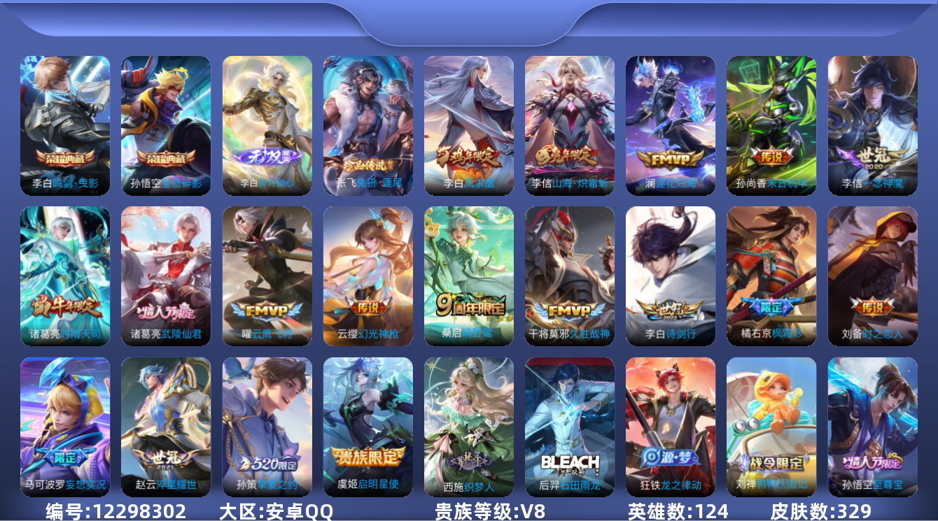 [12298302]V8 2典藏 1无双 1珍品传说 18传说 124英雄 329皮肤 可修改实名 优质装备:鸣剑·曳影,全息碎影(猴子典藏),碎月剑心(李白无双),云鹰飞将(小将军),久胜战神,一念神魔,末日机甲-孙尚香(绿蚂蚱),时之恋人-刘备(电焊工),淬星耀世,挚爱之约,山海·炽霜斩(李信年限),妄想实况,澜逐花归海 珍品传说:兔狲·蓬尾 传说皮:幻光神枪 珍宝阁皮:万物之道,优雅恋人,蔷薇恋人,玩趣恶龙 限定皮:鸣野蒿,至尊宝,凤求凰(白切鸡),梅西,武陵仙君(小桃花),傲雪梅枪,时雨天司(水龙头),神威(电光马子),飞衡(韩信年限),高山流水,诗剑行,匿光决锋者,五谷丰年,梁祝,李小龙,辉光之辰,默契交锋-花木兰,孙行者,一生所爱,大圣娶亲,青春决赛季,枫霜尽,山海·玄木吟(马可年限) 史诗皮:鸭鸭历险记-刘禅,器灵·浮梦炉,星界战将,龙之律动,石田雨龙,茶境仙,破空之剑,决胜骁骑,织梦人,紫霞仙子,苍穹之光,电玩小子(小书包),白龙吟,黄金分割率,特工魅影,千年之狐,永昼,江河有灵,魅语,蒙恬荣光圣徽,无限星赏官,冰冠公主,偶像歌手,暗夜猫娘,末日机甲-吕布,猫狗日记-孙策,猫狗日记-大乔,乱世虎臣,节奏热浪,修罗,女仆咖啡,摇滚巨星,水果甜心,天才门将,星夜王子,心灵骇客,功夫厨神,德古拉伯爵,暗隐猎兽者,幽灵船长,鬼剑武藏,心灵战警,乐园奇幻夜,舞动绿茵,地狱岩魂,纤云弄巧,缤纷独角兽,乘风破浪,逐浪之夏,月团寄思,水晶猎龙者,金属风暴,原初追逐者,圣诞狂欢,圣诞恋歌,鹰眼统帅,暗夜贵公子,魅力维加斯,黎明之约,无心,未来纪元-赵云