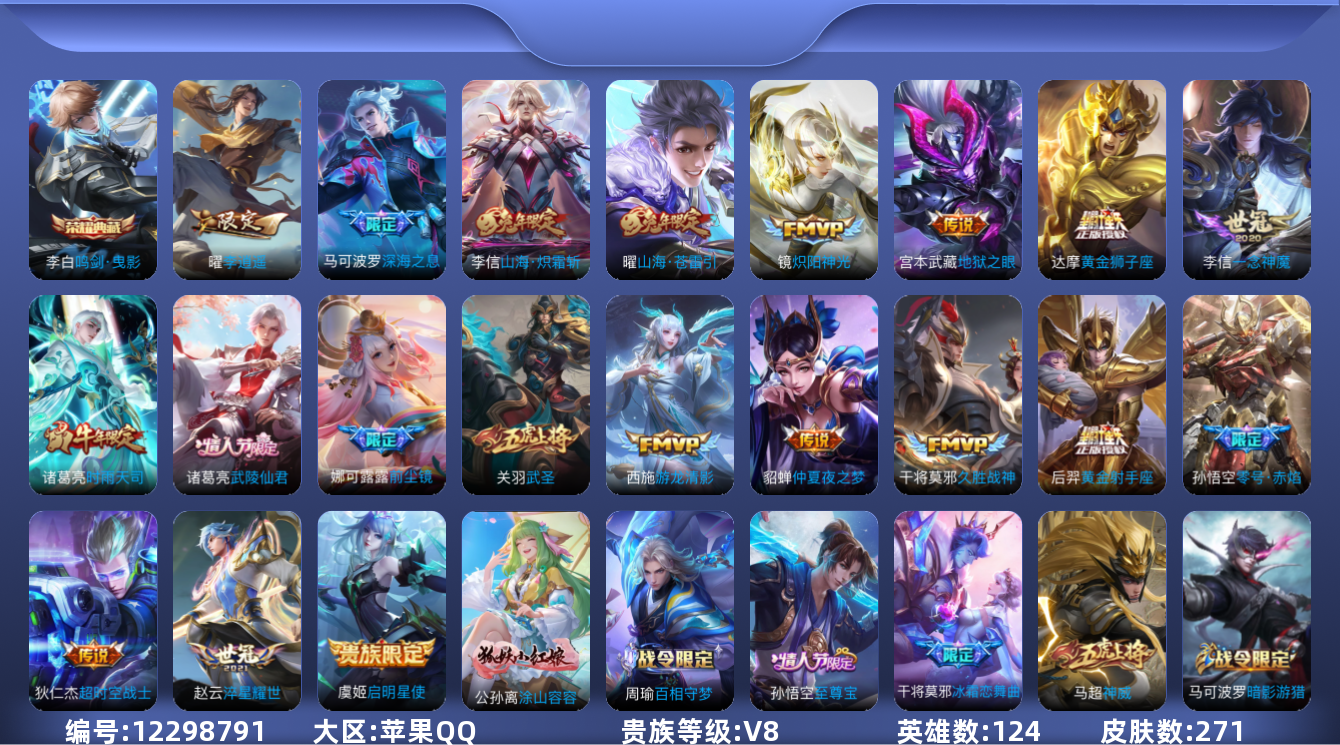 - PX_2095935-实名: 可修改 贵族等级: V5 英雄数: 124 皮肤数: 163 传说皮: 乘龙·问璇玑 限定皮: 李小龙,梁祝,御风骁将,引擎之心,飞衡,大圣娶亲,五谷丰年,山海·玄木吟,鸣野蒿,逐霄战戟