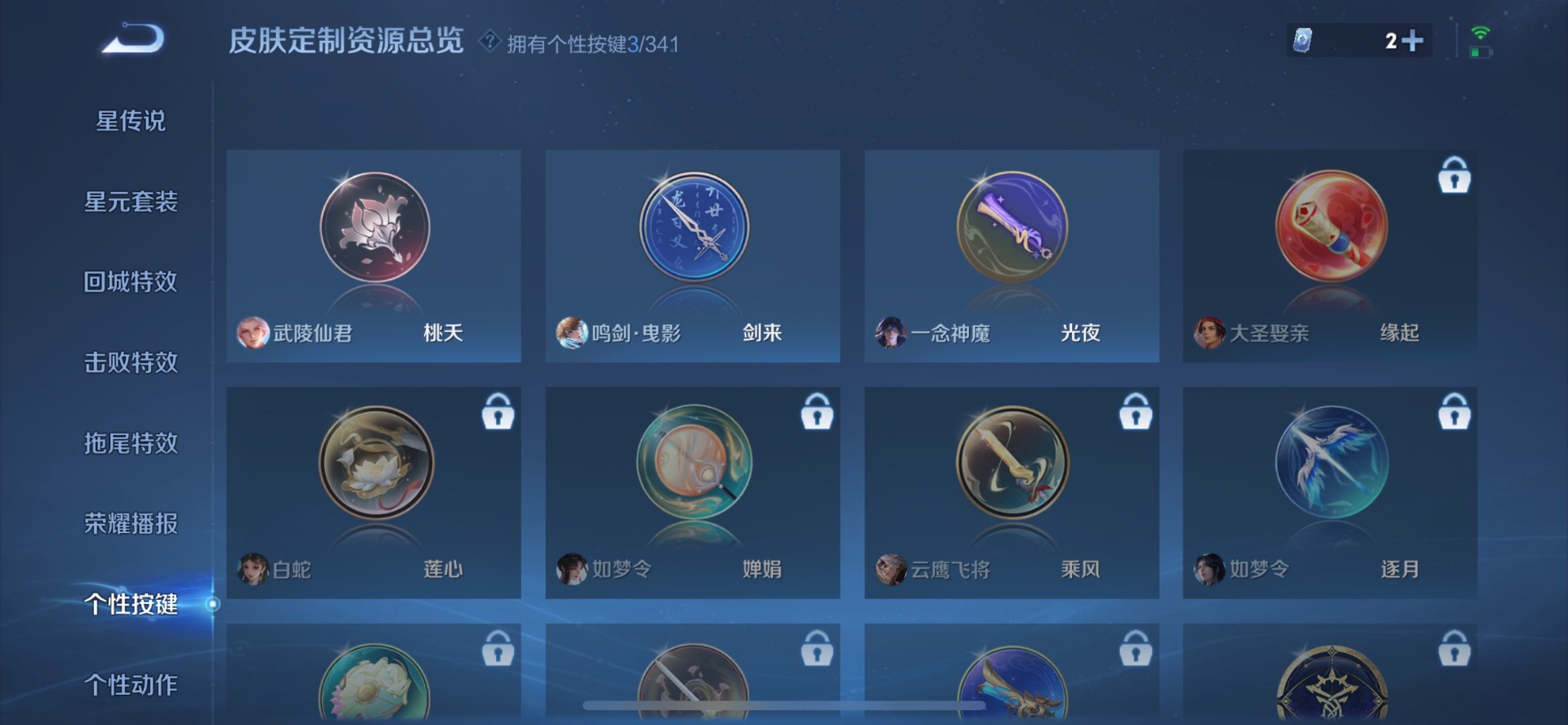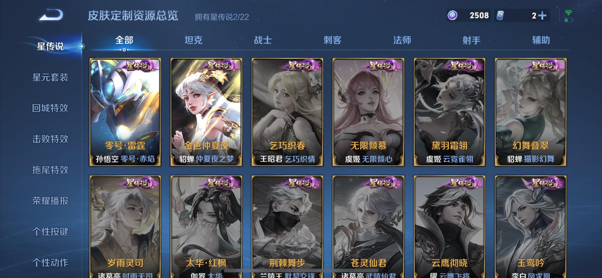 大乔白鹤梁神女,伽罗天狼溯光者,干将莫邪冰霜恋舞曲,镜匿光追影者,诸葛亮时雨天司,杨玉环寅虎·心曲,公孙离蜜橘之夏,裴擒虎李小龙,上官婉儿梁祝,花木兰青春决赛季,马可波罗逐梦之星,马可波罗深海之息,猪八戒猪悟能,孙悟空至尊宝,马超神威,韩信傲雪梅枪,韩信飞衡,韩信逐梦之影,娜可露露前尘镜,关羽武圣,关羽冰锋战神