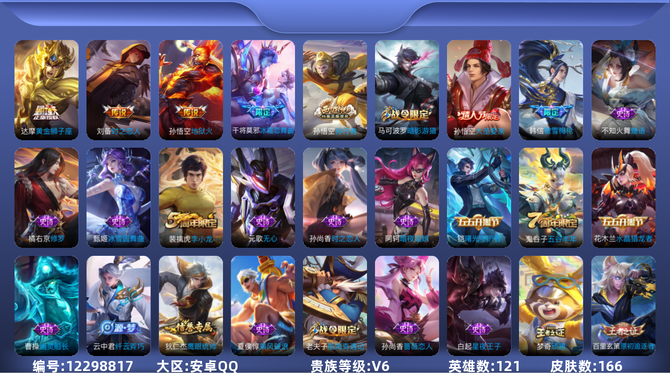 [12298817]【商品标题】:安卓Q-V0-荣耀黄金I段位-121英雄-166皮肤-0典藏-0珍品无双-0无双-0珍品传说-3传说-41史诗