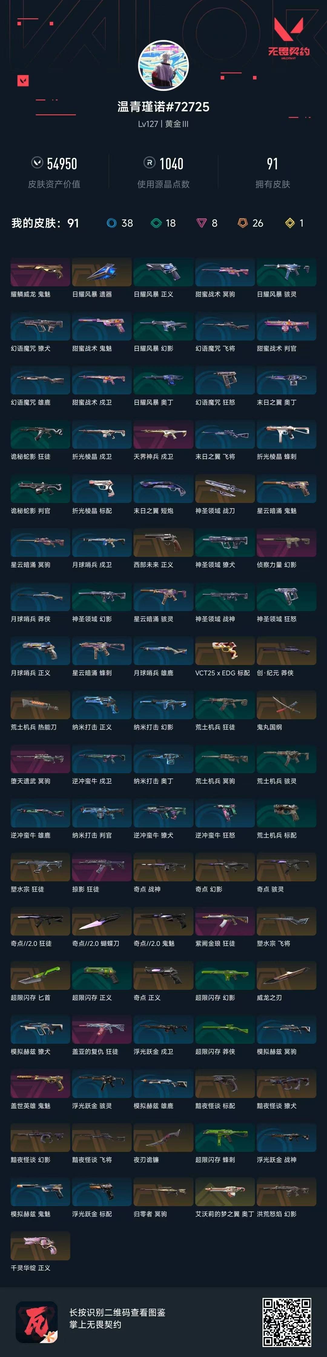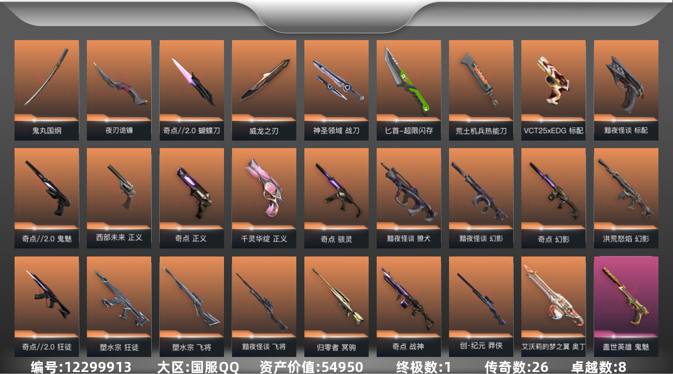 [12299913]26橙皮 1金皮 8紫皮 91皮肤 25英雄 113卡面 1040已用源晶 黄金 优质装备:黯夜怪谈套装,奇点//2.0套装,正义-奇点,冥驹-归零者,狂徒-塑水宗,狂徒-掠影,幻影-奇点,狂徒-紫阙金琅,狂徒-盖亚的复仇,幻影-侦察力量,冥驹-堕天遗武,幻影-洪荒怒焰,正义-千灵华绽,幻影-黯夜怪谈,狂徒-奇点//2.0,奥丁-艾沃莉的梦之翼,骇灵-奇点,戍卫-天界神兵,鬼魅-盖世英雄,飞将-塑水宗,威龙之刃,夜刃诡镰,匕首-超限闪存,鬼魅-奇点//2.0,蝴蝶刀-奇点//2.0,荒土机兵热能刀,鬼丸国纲,神圣领域 战刀,鬼魅-耀鳞威龙 佩枪皮肤:标配-黯夜怪谈,标配-VCT25xEDG,正义-西部未来 步枪皮肤:獠犬-黯夜怪谈 狙击枪皮肤:莽侠-创·纪元,飞将-黯夜怪谈 机枪皮肤:战神-奇点