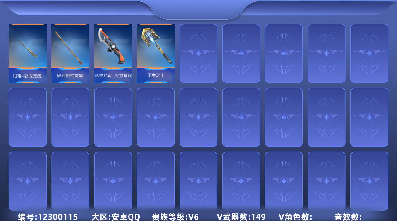 [12300115]V6 可二次 可修改实名 V6 3王者武器 149英雄武器 298万化 枪皇SS 武器:王者之击,王者之影闪光弹,丛林匕首-火力竞放,黑骑士手雷,黑骑士闪光弹,黑骑士烟雾弹,火麒麟手雷,火麒麟闪光弹,火麒麟烟雾弹,燃烧弹-游骑兵,烟雾弹-游骑兵,闪光弹-游骑兵,雷神手雷,雷神烟雾弹,雷神闪光弹,破邪蛇棍觉醒,甩棍-卧龙觉醒,分裂雷-偃蛇,王者之竞烟雾弹,烟雾弹-星际宇航,烟雾弹-遁天梭-重山盾,手雷-游骑兵,黑骑士燃烧弹