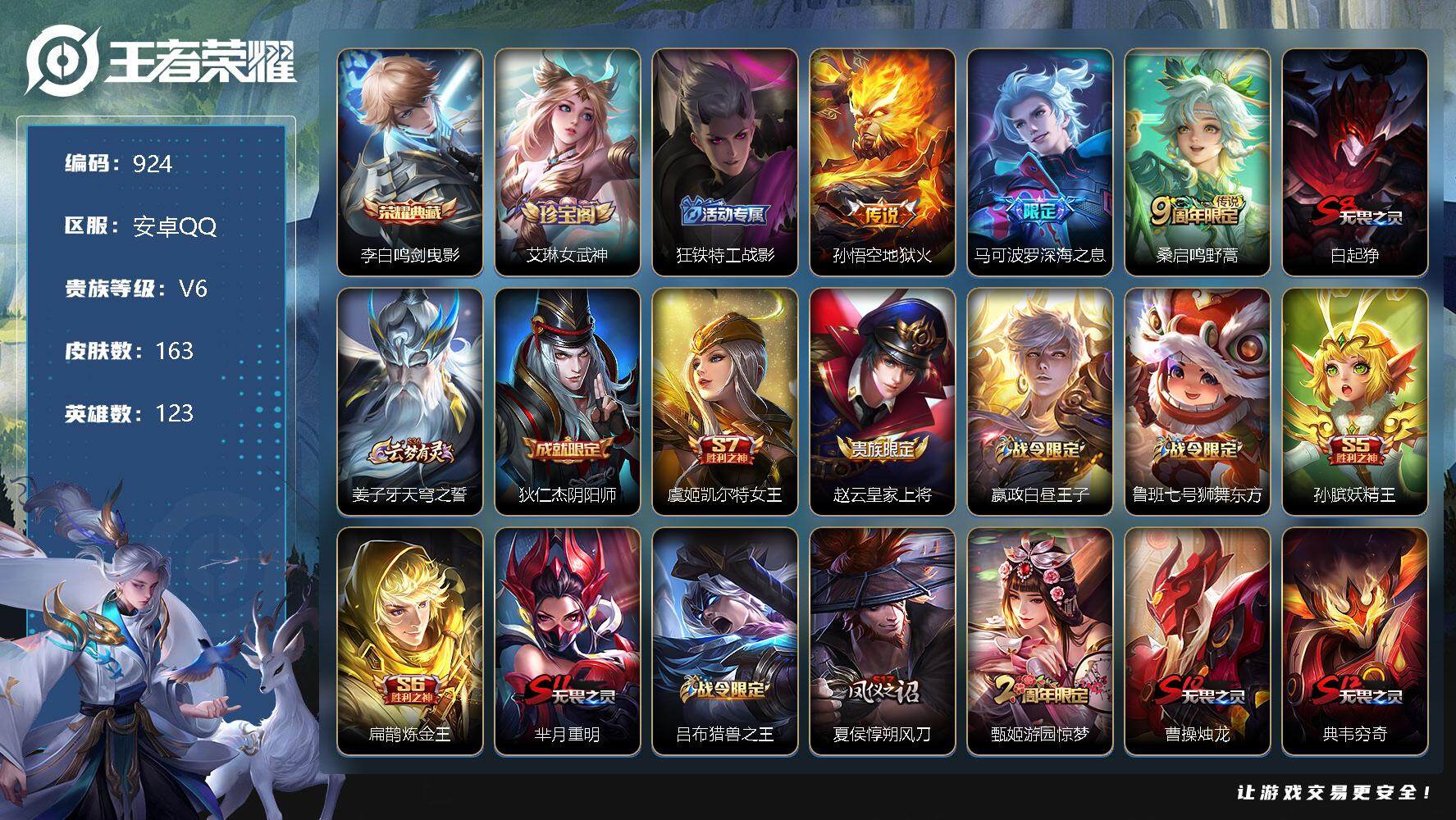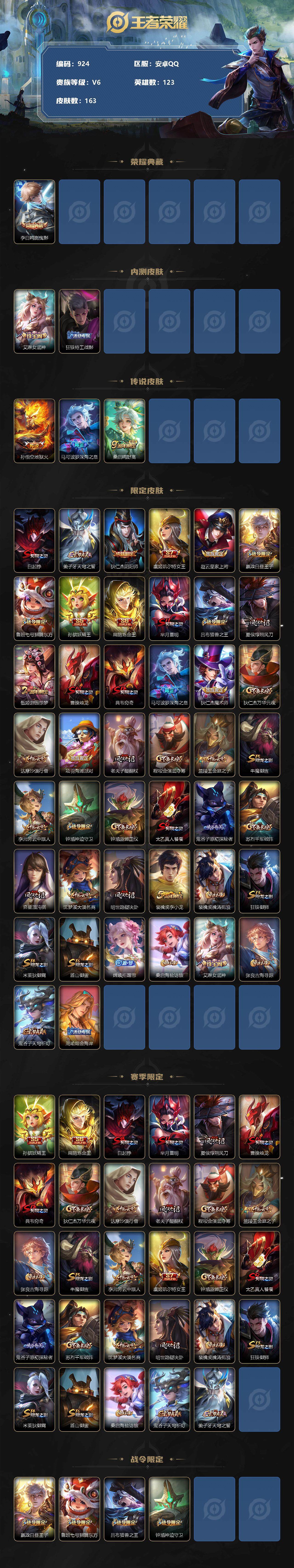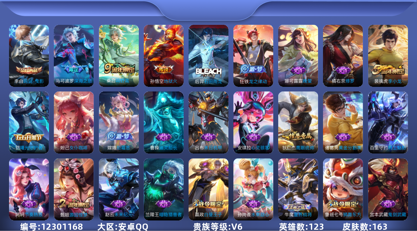 [12301168]【商品标题】:安卓Q-V3-至尊星耀III段位-123英雄-163皮肤-1典藏-0珍品无双-0无双-0珍品传说-3传说-33史诗