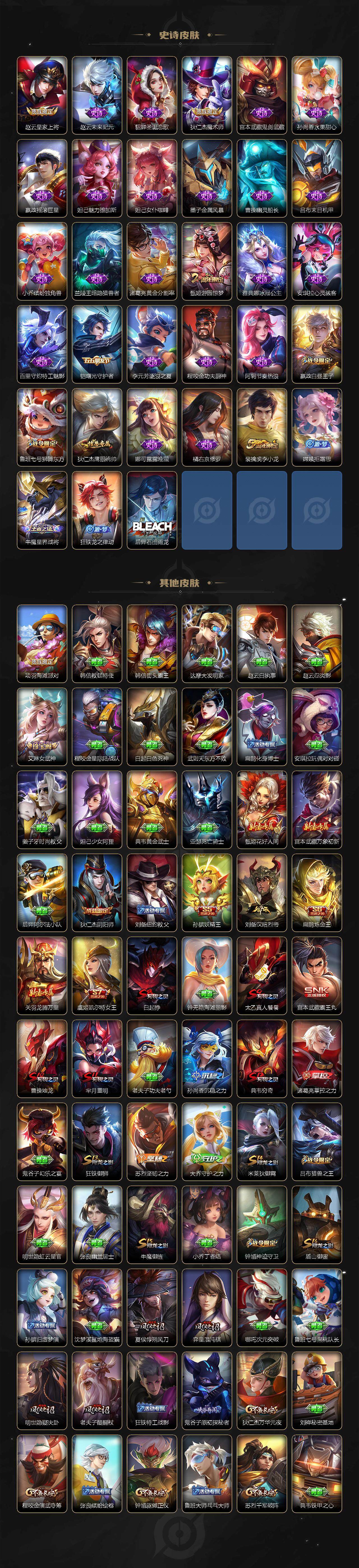 【史诗皮肤】:赵云皇家上将,赵云未来纪元,貂蝉圣诞恋歌,狄仁杰魔术师,宫本武藏鬼剑武藏,孙尚香水果甜心,嬴政摇滚巨星,妲己魅力维加斯,妲己女仆咖啡,墨子金属风暴,曹操幽灵船长,吕布末日机甲,小乔缤纷独角兽,兰陵王暗隐猎兽者,诸葛亮黄金分割率,甄姬游园惊梦,雅典娜冰冠公主,安琪拉心灵骇客,百里守约特工魅影,铠曙光守护者,李元芳逐浪之夏,程咬金功夫厨神,阿轲节奏热浪,嬴政白昼王子,鲁班七号狮舞东方,狄仁杰鹰眼统帅,娜可露露晚萤,橘右京修罗,裴擒虎李小龙,嫦娥拒霜思,牛魔星界战将,狂铁龙之律动,后羿石田雨龙