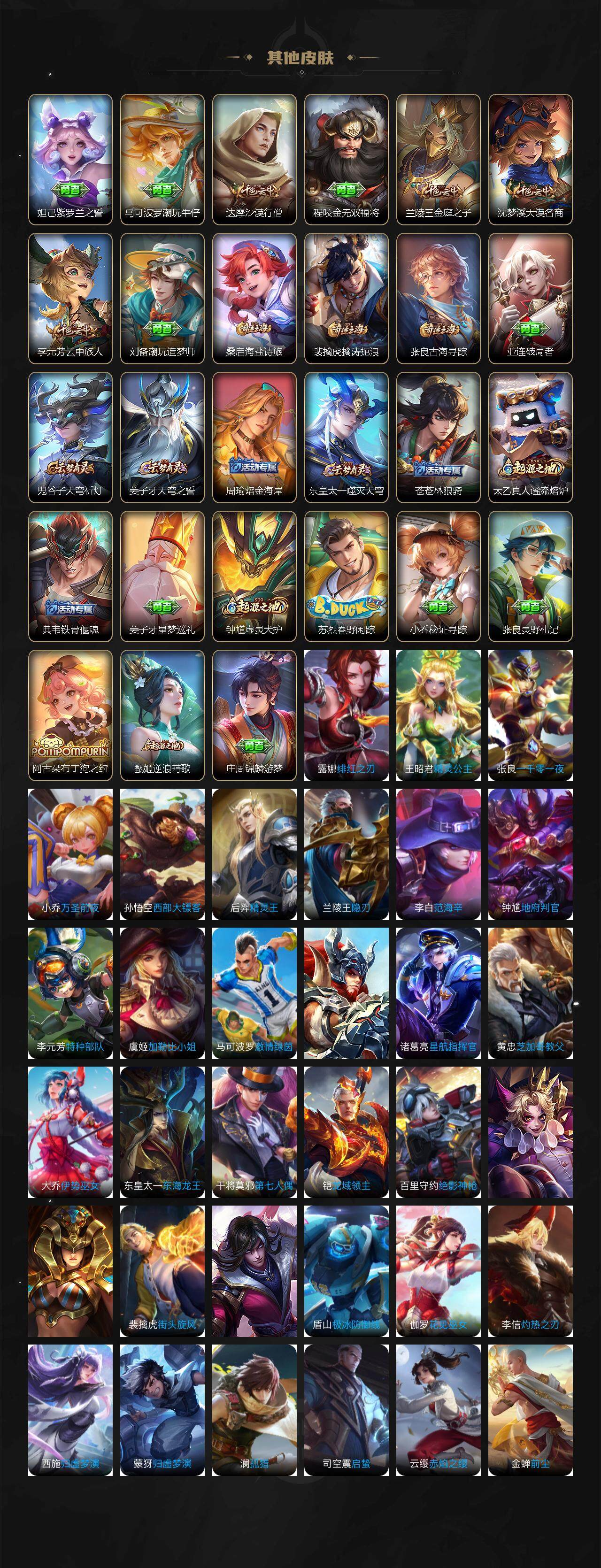【限定皮肤】:白起狰,姜子牙天穹之誓,狄仁杰阴阳师,虞姬凯尔特女王,赵云皇家上将,嬴政白昼王子,鲁班七号狮舞东方,孙膑妖精王,扁鹊炼金王,芈月重明,吕布猎兽之王,夏侯惇朔风刀,甄姬游园惊梦,曹操烛龙,典韦穷奇,马可波罗深海之息,狄仁杰魔术师,狄仁杰万华元夜,达摩沙漠行僧,项羽海滩派对,老夫子醍醐杖,程咬金演武夺筹,兰陵王金庭之子,牛魔御旌,李元芳云中旅人,钟馗神迹守卫,钟馗驱傩正仪,太乙真人饕餮,鬼谷子原初探秘者,苏烈千军破阵,弈星混沌棋,沈梦溪大漠名商,明世隐疑决卦,裴擒虎李小龙,裴擒虎擒涛扼浪,狂铁御狮,米莱狄御霄,盾山御銮,嫦娥拒霜思,桑启海盐诗旅,艾琳女武神,张良古海寻踪,鬼谷子天穹祈灯,周瑜熔金海岸