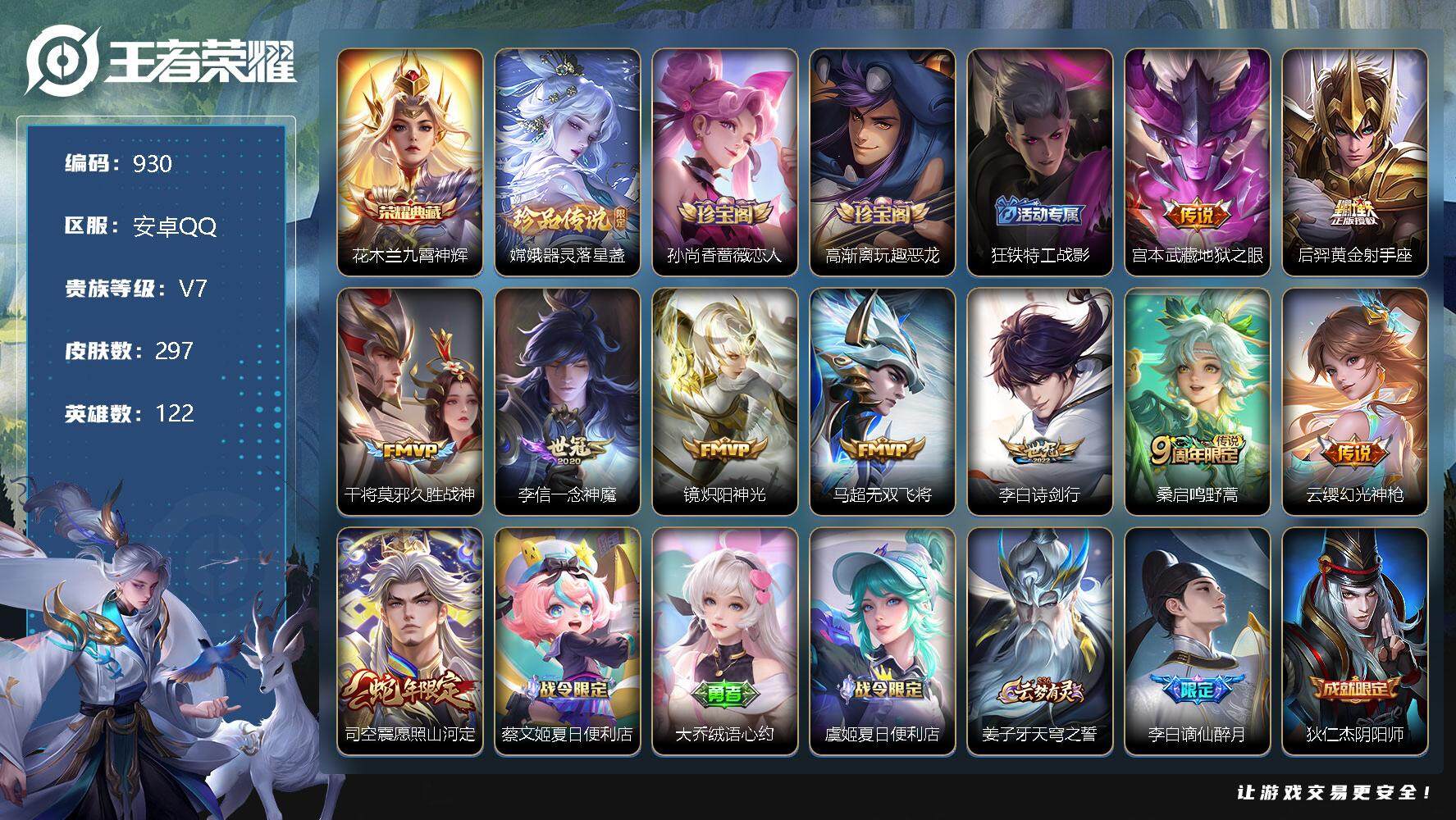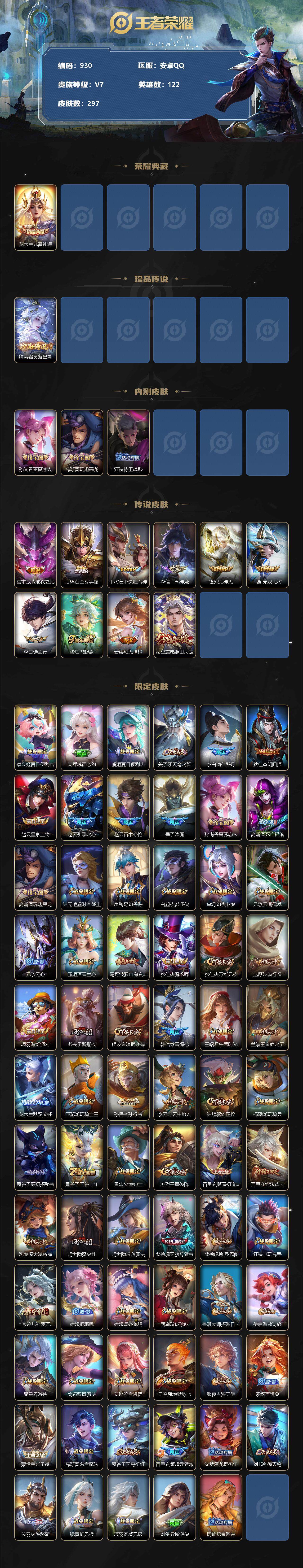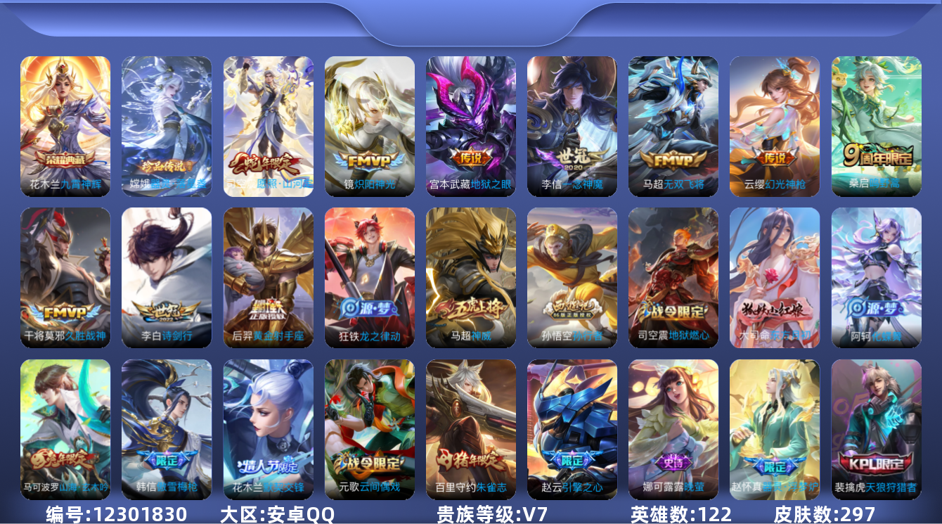 [12301830]【商品标题】:安卓Q-V6-最强王者段位-122英雄-297皮肤-1典藏-0珍品无双-0无双-1珍品传说-10传说-82史诗