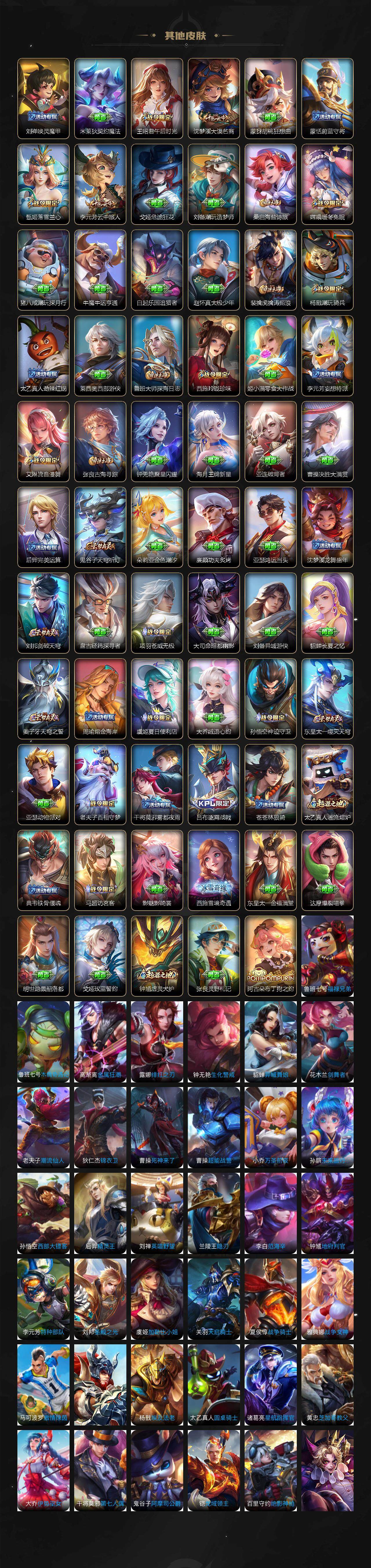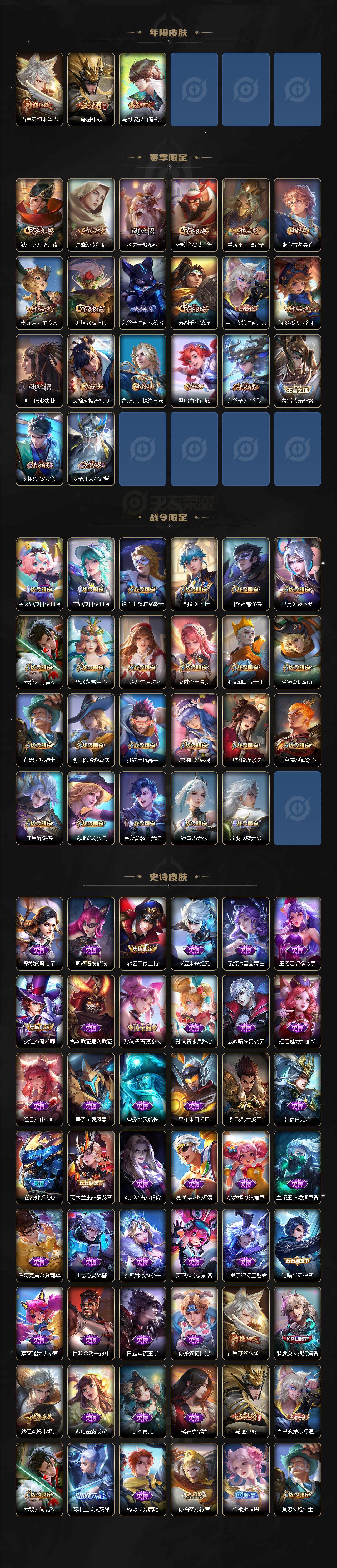 【赛季限定】:狄仁杰万华元夜,达摩沙漠行僧,老夫子醍醐杖,程咬金演武夺筹,兰陵王金庭之子,张良古海寻踪,李元芳云中旅人,钟馗驱傩正仪,鬼谷子原初探秘者,苏烈千军破阵,百里玄策原初追逐者,沈梦溪大漠名商,明世隐疑决卦,裴擒虎擒涛扼浪,鲁班大师探海日志,桑启海盐诗旅,鬼谷子天穹祈灯,蒙恬荣光圣徽,刘邦剑破天穹,姜子牙天穹之誓