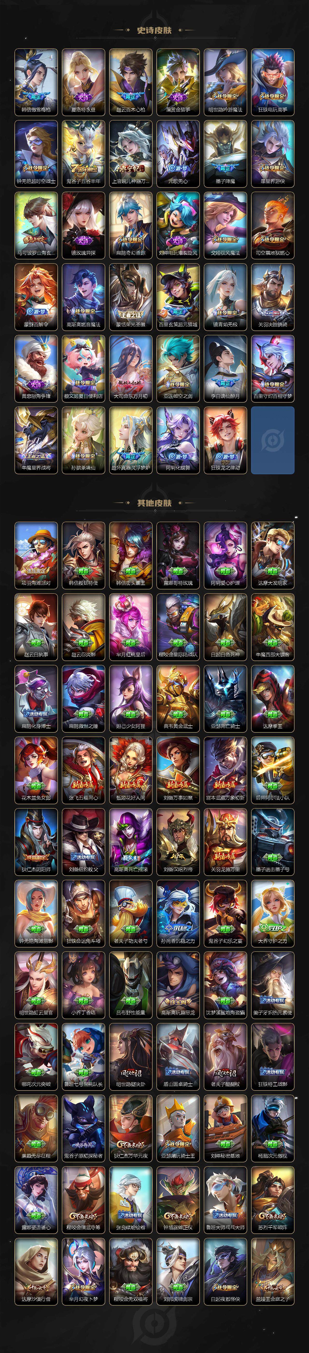 【限定皮肤】:蔡文姬夏日便利店,大乔绒语心约,虞姬夏日便利店,姜子牙天穹之誓,李白谪仙醉月,狄仁杰阴阳师,赵云皇家上将,赵云引擎之心,赵云百木心枪,墨子降魔,孙尚香蔷薇恋人,高渐离死亡摇滚,高渐离玩趣恶龙,钟无艳超时空战士,扁鹊奇幻香踪,白起夜都怪侠,芈月幻夜卜梦,元歌云间偶戏,元歌无心,甄姬落雪兰心,马可波罗山海玄木吟,狄仁杰魔术师,狄仁杰万华元夜,达摩沙漠行僧,项羽海滩派对,老夫子醍醐杖,程咬金演武夺筹,韩信傲雪梅枪,王昭君午后时光,兰陵王金庭之子,花木兰默契交锋,亚瑟潮玩骑士王,孙悟空孙行者,李元芳云中旅人,钟馗驱傩正仪,杨戬潮玩骑兵,鬼谷子原初探秘者,鬼谷子五谷丰年,黄忠火炮绅士,苏烈千军破阵,百里玄策原初追逐者,百里守约朱雀志,沈梦溪大漠名商,明世隐疑决卦,明世隐吟游魔法,裴擒虎天狼狩猎者,裴擒虎擒涛扼浪,狂铁电玩高手,上官婉儿神器万象笔,嫦娥拒霜思,嫦娥暖冬兔眠,西施玲珑珍味,鲁班大师探海日志,桑启海盐诗旅,暃星界游侠,戈娅驭风魔法,艾琳流音漫舞,司空震地狱燃心,张良古海寻踪,蒙犽百解令,蒙恬荣光圣徽,高渐离燃音魔法,鬼谷子天穹祈灯,百里玄策超元猎域,沈梦溪龙舞盛年,刘邦剑破天穹,关羽决胜骁骑,镜青焰无极,项羽苍威无极,刘备异域游侠,周瑜熔金海岸