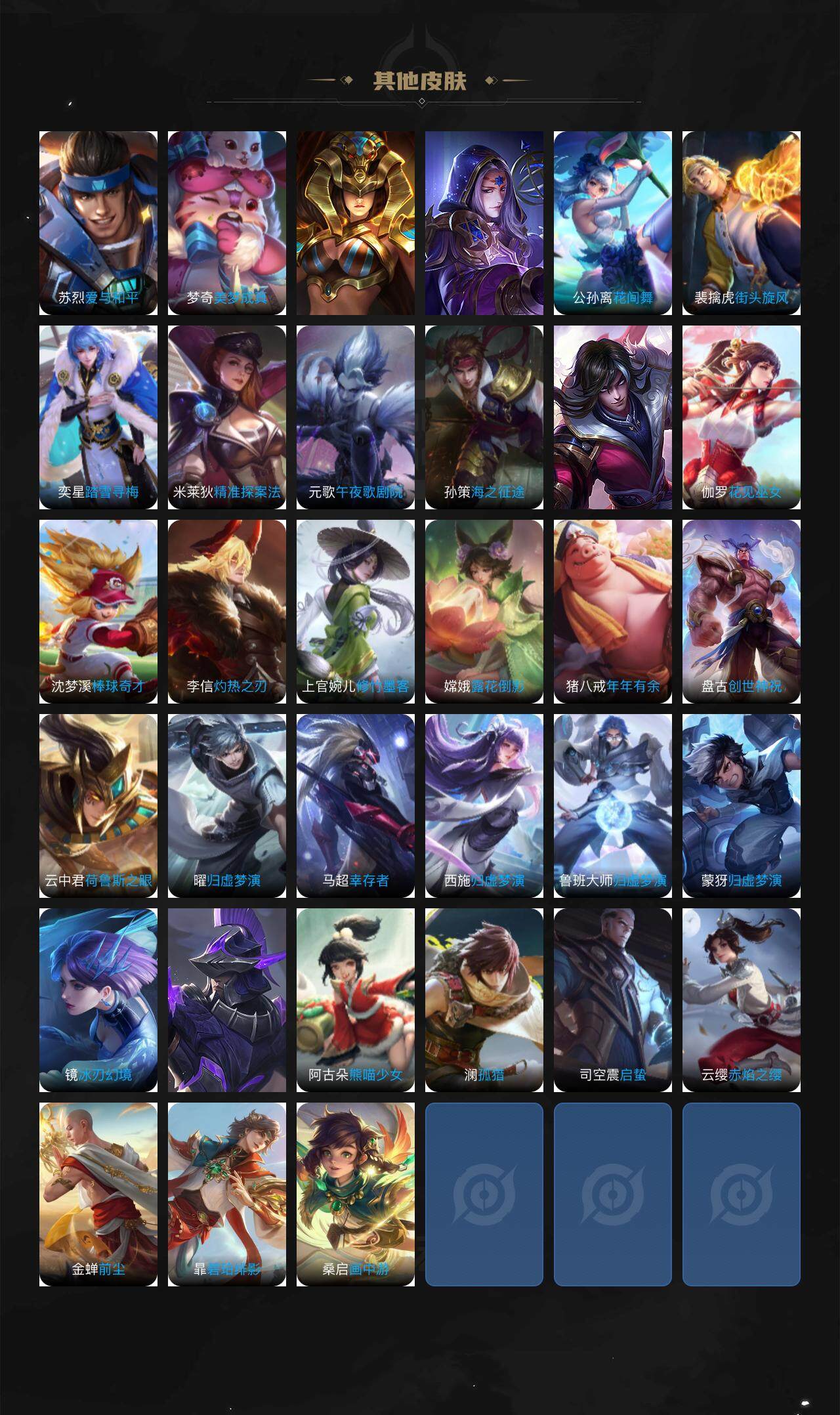 小乔青蛇,娜可露露晚萤,孙策猫狗日记,露娜紫霞仙子,诸葛亮黄金分割率,王昭君偶像歌手,韩信白龙吟,阿轲暗夜猫娘,雅典娜冰冠公主,吕布末日机甲,橘右京修罗,白起星夜王子,安琪拉心灵骇客,程咬金功夫厨神,刘邦德古拉伯爵,兰陵王暗隐猎兽者,曹操幽灵船长,宫本武藏鬼剑武藏,亚瑟心灵战警,杨戬天秀·启明,蔡文姬舞动绿茵,小乔缤纷独角兽,夏侯惇乘风破浪,花木兰水晶猎龙者,铠曙光守护者,墨子金属风暴,百里玄策原初追逐者,百里守约特工魅影,嬴政暗夜贵公子,嫦娥拒霜思,夏洛特永昼,澜赏金猎手,镜玫瑰异探,刘禅电玩·爆裂旋风,蒙犽百解令,高渐离燃音魔法,关羽决胜骁骑,李白谪仙醉月,赵怀真器灵·浮梦炉