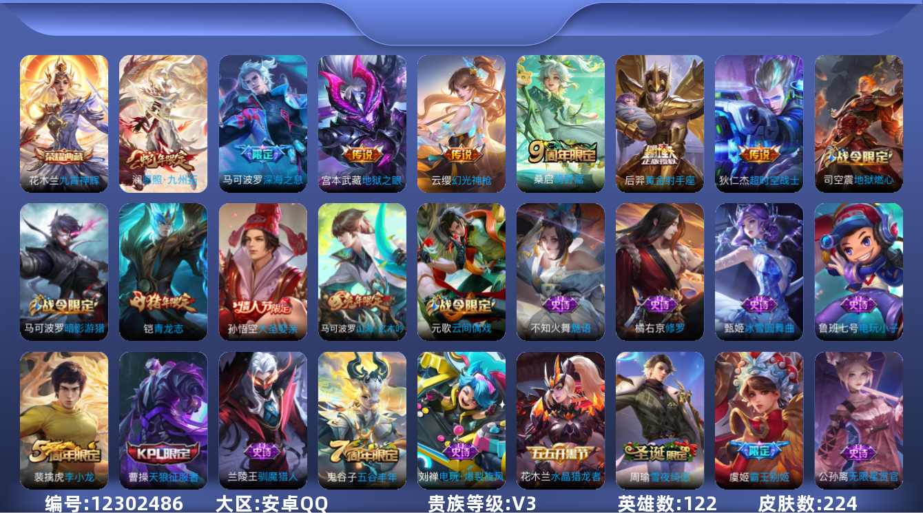 [12302486]【商品标题】:安卓Q-V3-至尊星耀V段位-122英雄-224皮肤-1典藏-0珍品无双-0无双-0珍品传说-7传说-73史诗