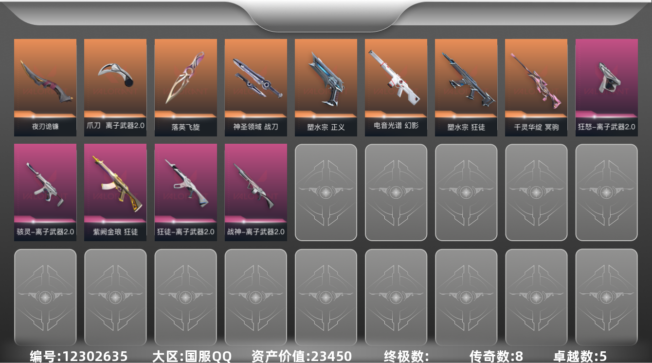 [12302635]8橙皮 5紫皮 40皮肤 20英雄 48卡面 480已用源晶 未定级 优质装备:狂徒-塑水宗,冥驹-千灵华绽,狂徒-紫阙金琅,正义-塑水宗,落英飞旋,夜刃诡镰,神圣领域 战刀,离子武器2.0 爪刀 套装:离子武器2.0 佩枪皮肤:狂怒-离子武器2.0 冲锋枪皮肤:骇灵-离子武器2.0 步枪皮肤:幻影-电音光谱,狂徒-离子武器2.0 机枪皮肤:战神-离子武器2.0