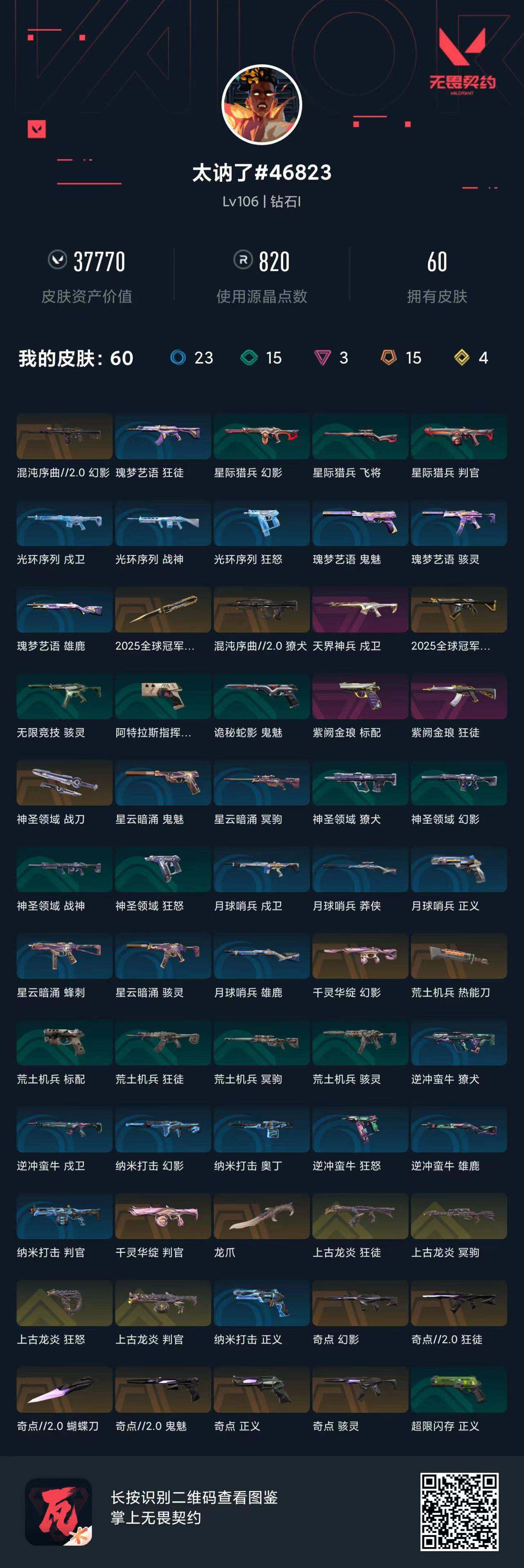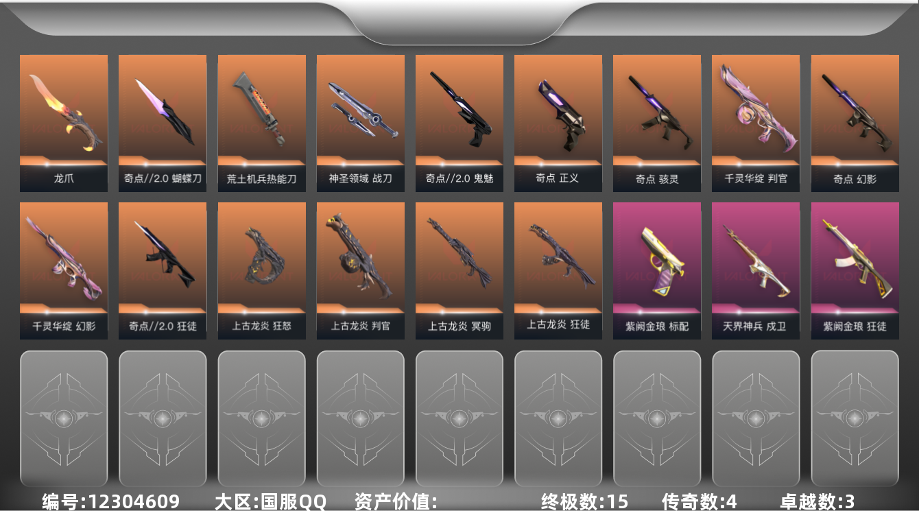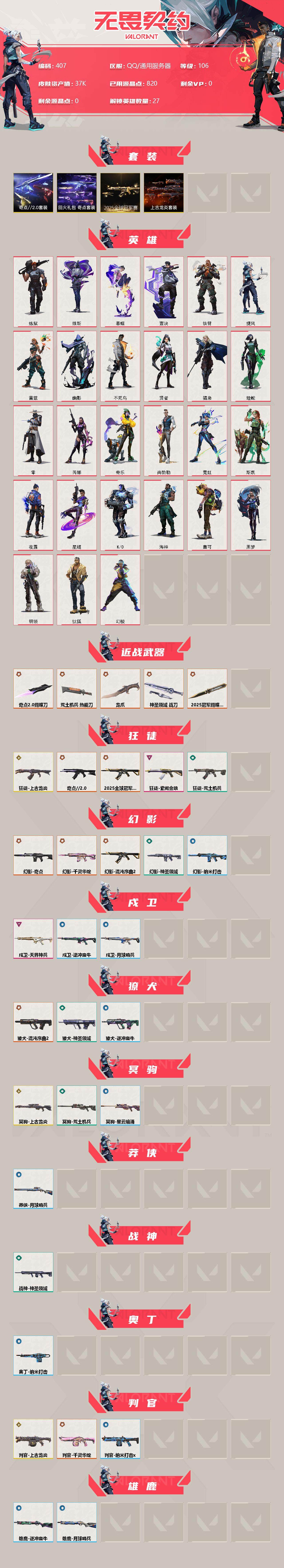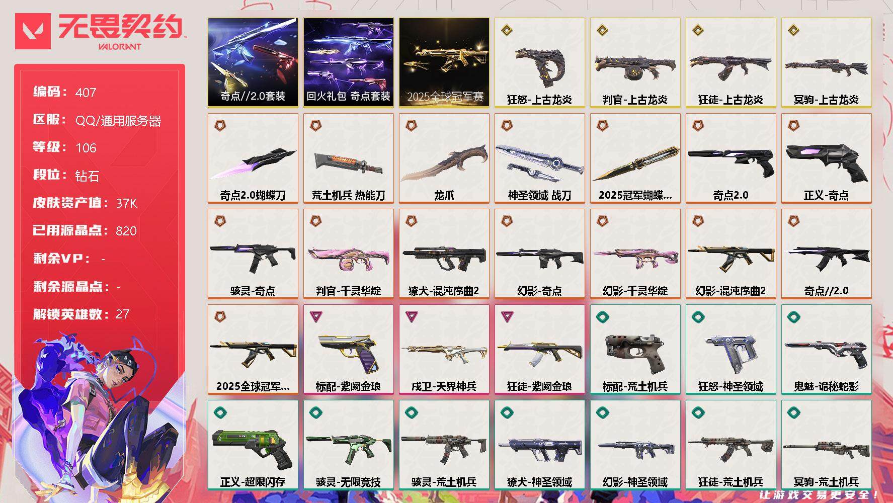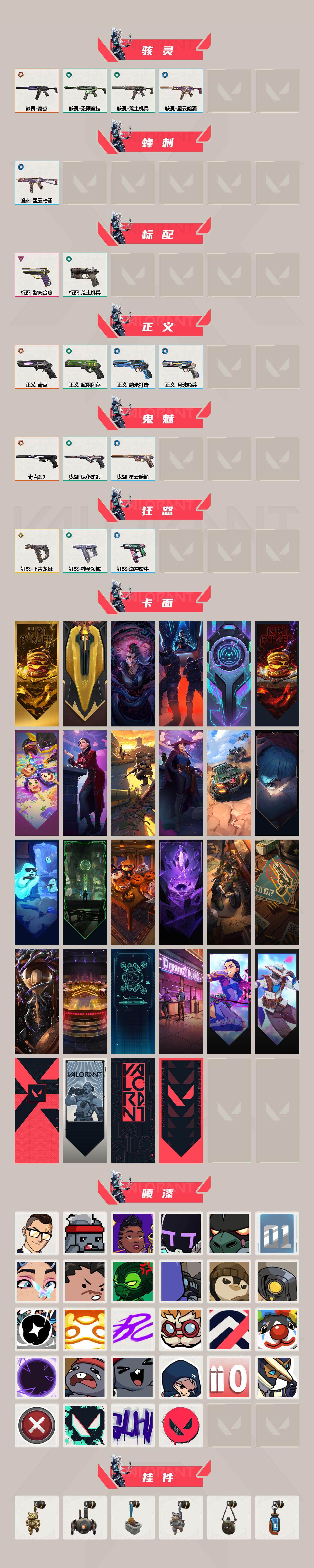 [12304609]【套装】:2025全球冠军赛套装,上古龙炎套装,奇点//2.0套装,回火礼包:奇点套装 【英雄】:幻棱,炼狱,维斯,暮蝶,钛狐,壹决,铁臂,捷风,雷兹,幽影,不死鸟,贤者,猎枭,蝰蛇,零,芮娜,奇乐,尚勃勒,霓虹,斯凯,夜露,星礈,K/O,海神,盖可,黑梦,钢锁 【近战 武器】:近战武器-2025全球冠军赛 蝴蝶刀,近战武器-奇点//2.0 蝴蝶刀,近战武器-龙爪,近战武器-荒土机兵 热能刀,近战武器-神圣领域 战刀 【狂徒】:狂徒-上古龙炎,狂徒-2025全球冠军赛,狂徒-奇点//2.0,狂徒-紫阙金琅,狂徒-荒土机兵 【幻影】:幻影-奇点,幻影-千灵华绽,幻影-混沌序曲//2.0,幻影-神圣领域,幻影-纳米打击 【戍卫】:戍卫-天界神兵,戍卫-逆冲蛮牛,戍卫-月球哨兵 【獠犬】:獠犬-混沌序曲//2.0,獠犬-神圣领域,獠犬-逆冲蛮牛 【冥驹】:冥驹-上古龙炎,冥驹-荒土机兵,冥驹-星云暗涌 【莽侠】:莽侠-月球哨兵 【战神】:战神-神圣领域 【奥丁】:奥丁-纳米打击 【判官】:判官-上古龙炎,判官-千灵华绽,判官-纳米打击x 【雄鹿】:雄鹿-逆冲蛮牛,雄鹿-月球哨兵 【骇灵】:骇灵-奇点,骇灵-荒土机兵,骇灵-无限竞技,骇灵-星云暗涌 【蜂刺】:蜂刺-星云暗涌 【标配】:标配-紫阙金琅,标配-荒土机兵 【正义】:正义-奇点,正义-超限闪存,正义-纳米打击,正义-月球哨兵 【鬼魅】:鬼魅-奇点//2.0,鬼魅-诡秘蛇影,鬼魅-星云暗涌 【狂怒】:狂怒-上古龙炎,狂怒-神圣领域,狂怒-逆冲蛮牛 【卡面】:终章:激斗汉堡 卡面,进入射程 卡面,分崩离析 卡面,纳米打击 卡面,抑制技术 卡面,激斗汉堡 卡面,瓦娃脸雪糕 P2 卡面,从黄昏到黎明 卡面,荒土机兵 卡面,银弹猎手 卡面,逆冲蛮牛 卡面,《双城之战》拥抱 卡面,精灵大战 卡面,欢迎来到底城 卡面,南瓜盛典 卡面,奇点//2.0 卡面,修车达人 卡面,正义的化身 卡面,时间到 卡面,最高舞台 卡面,声感陷阱设计图 卡面,梦幻奶茶 卡面,无畏契约GO!第一卷:芮娜 卡面,无畏契约GO!第一卷:零 卡面,代号红色 卡面,新兵报到 卡面,V契约 卡面,无畏契约 卡面 【喷漆】:小小心意 喷漆,战“素”兔 喷漆,宇宙的指引 喷漆,请求重启 喷漆,逆冲蛮牛 喷漆,纳米打击 喷漆,鼻尖上的蝴蝶 喷漆,简笔画黯兽 喷漆,