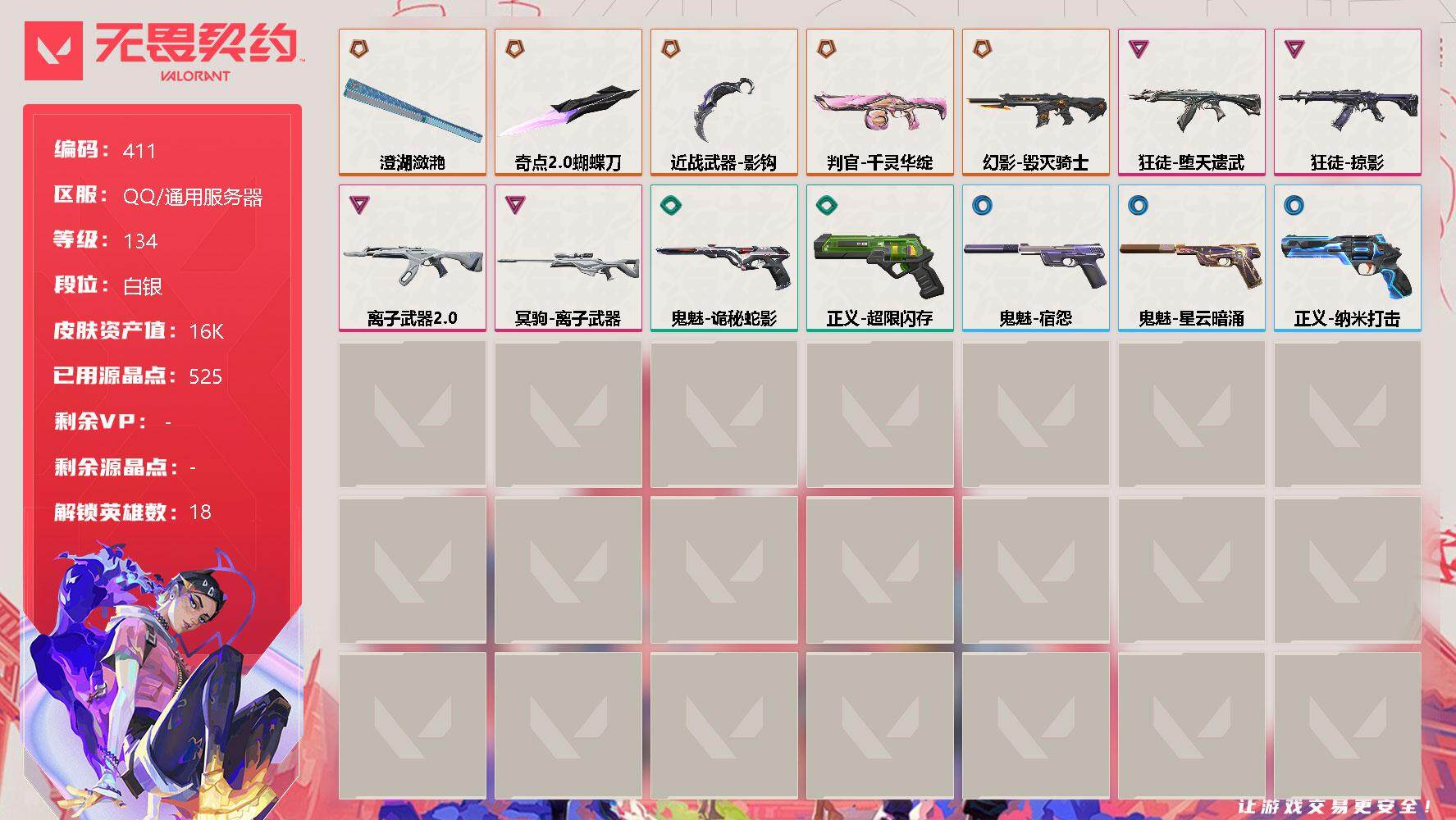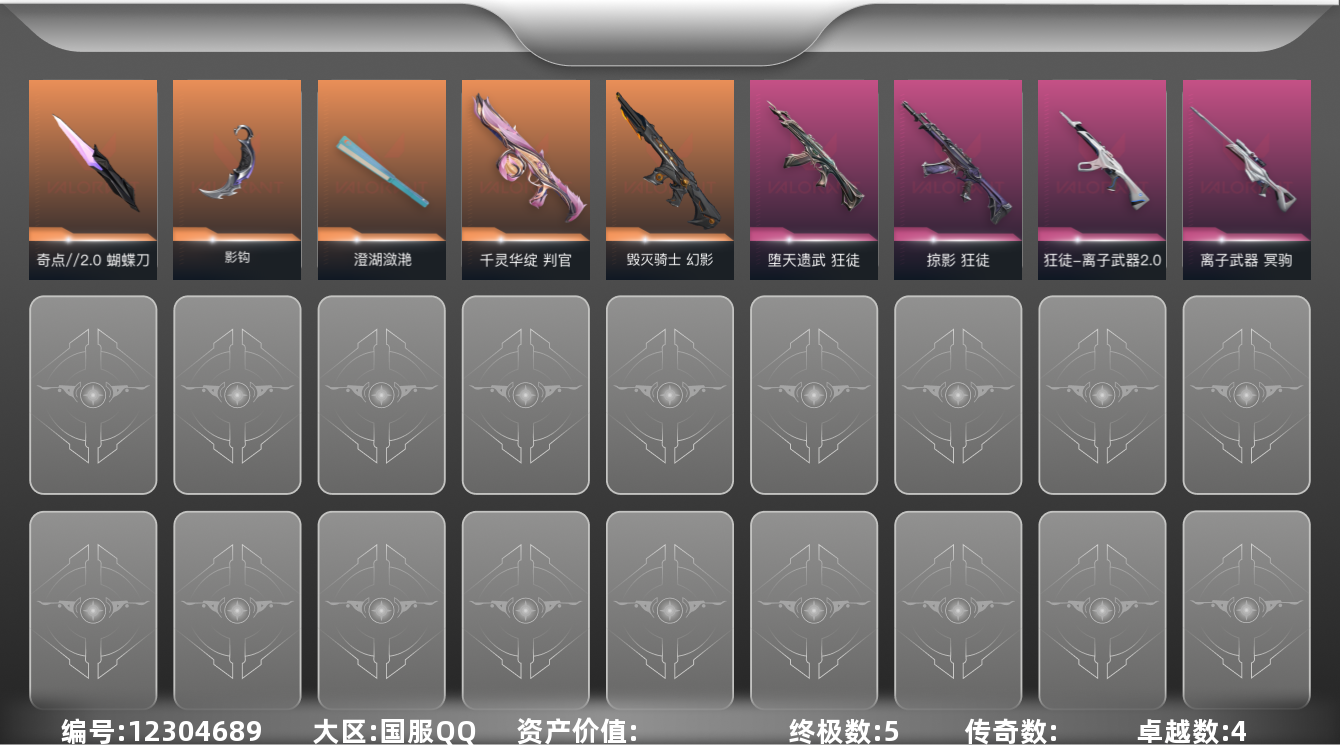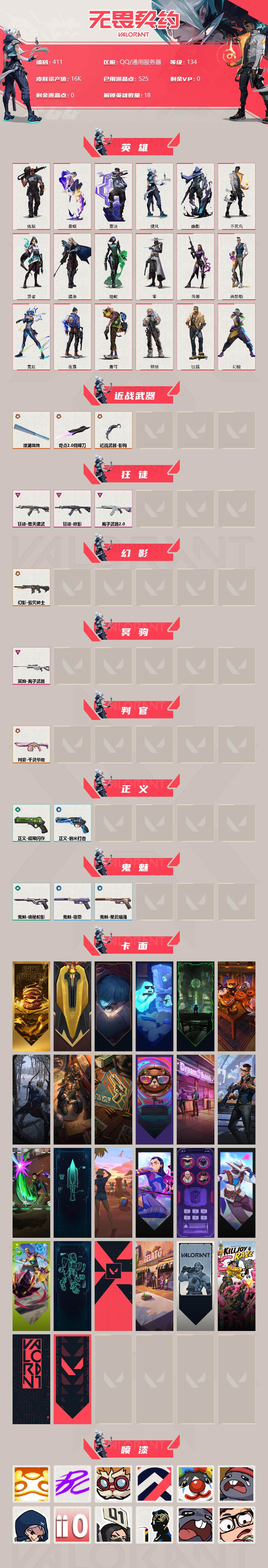 [12304689]【英雄】:幻棱,炼狱,暮蝶,钛狐,壹决,捷风,幽影,不死鸟,贤者,猎枭,蝰蛇,零,芮娜,尚勃勒,霓虹,夜露,盖可,钢锁 【近战 武器】:近战武器-影钩,近战武器-奇点//2.0 蝴蝶刀,近战武器-澄湖潋滟 【狂徒】:狂徒-堕天遗武,狂徒-掠影,狂徒-离子武器//2.0 【幻影】:幻影-毁灭骑士 【冥驹】:冥驹-离子武器 【判官】:判官-千灵华绽 【正义】:正义-超限闪存,正义-纳米打击 【鬼魅】:鬼魅-诡秘蛇影,鬼魅-宿怨,鬼魅-星云暗涌 【卡面】:终章:激斗汉堡 卡面,进入射程 卡面,《双城之战》拥抱 卡面,精灵大战 卡面,欢迎来到底城 卡面,南瓜盛典 卡面,钢弓与箭弦 卡面,修车达人 卡面,正义的化身 卡面,音熊登场 卡面,梦幻奶茶 卡面,西装暴徒 卡面,源能反应 卡面,零点嗅探设计图 卡面,沙雕爆能器 卡面,无畏契约GO!第一卷:芮娜 卡面,清除名单 卡面,无畏契约GO!第一卷:零 卡面,势不可挡//盖可 卡面,铁臂设计图 卡面,代号红色 卡面,冰淇淋店 卡面,新兵报到 卡面,友军火力 卡面,V契约 卡面,无畏契约 卡面 【喷漆】:嗨宝南瓜灯 喷漆,嘭! 喷漆,都算到了 喷漆,控场勿近 喷漆,小丑猫 喷漆,熊抱 喷漆,捷风差距 喷漆,拼一枪 喷漆,我觉得不行 喷漆,致命优雅 喷漆,我的刀呢? 喷漆,新潮流 喷漆,双击点赞 喷漆,买装还是存钱 喷漆,蕊形灯 喷漆,口袋贤者 喷漆,胜利属于无畏契约 喷漆,GLHF 喷漆,无畏契约 喷漆 【挂饰】:终章:猫猫木乃伊 挂饰,悠闲鸡块 挂饰,伞绳 挂饰,《双城之战》小蛋糕 挂饰,第九季//第三幕 纪念币 挂饰,拳击战术熊 挂饰,工具腰带 挂饰,无畏契约GO!第一卷 芮娜 挂饰,无畏契约GO!第一卷 零 挂饰,熔岩灯 挂饰,第九季//第二幕 纪念币 挂饰,袖珍捷风 挂饰,Z世代特饮 挂饰,第九季//第一幕 纪念币 挂饰,战术河童 挂饰,荧光棒 挂饰,第八季//第三幕 纪念币 挂饰,第八季//第二幕 纪念币 挂饰 ,天外飞客 挂饰,第七季//第三幕 纪念币 挂饰,幸运中国结 挂饰,无畏契约 纪念币 挂饰
