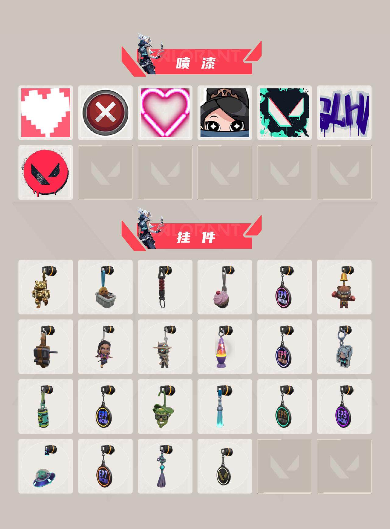 【喷漆】:嗨宝南瓜灯 喷漆,嘭! 喷漆,都算到了 喷漆,控场勿近 喷漆,小丑猫 喷漆,熊抱 喷漆,捷风差距 喷漆,拼一枪 喷漆,我觉得不行 喷漆,致命优雅 喷漆,我的刀呢? 喷漆,新潮流 喷漆,双击点赞 喷漆,买装还是存钱 喷漆,蕊形灯 喷漆,口袋贤者 喷漆,胜利属于无畏契约 喷漆,GLHF 喷漆,无畏契约 喷漆