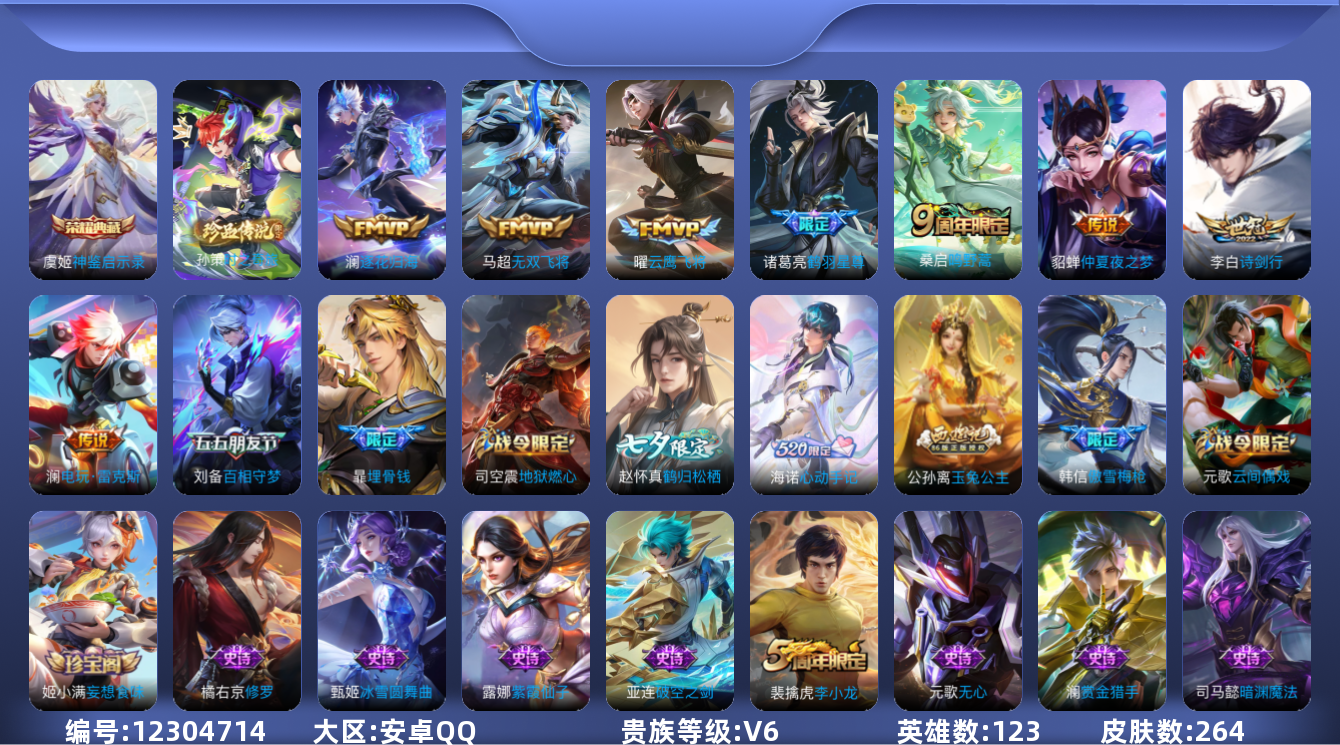 [12304714]【商品标题】:安卓Q-V6-永恒钻石I段位-123英雄-264皮肤-1典藏-0珍品无双-0无双-1珍品传说-8传说-71史诗