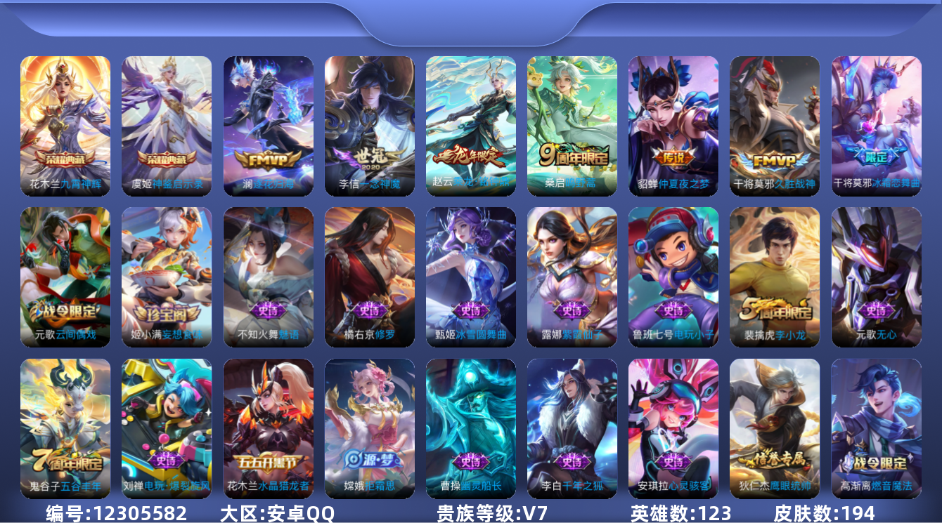 [12305582]【商品标题】:安卓Q-V4-最强王者段位-123英雄-194皮肤-2典藏-0珍品无双-0无双-0珍品传说-6传说-54史诗