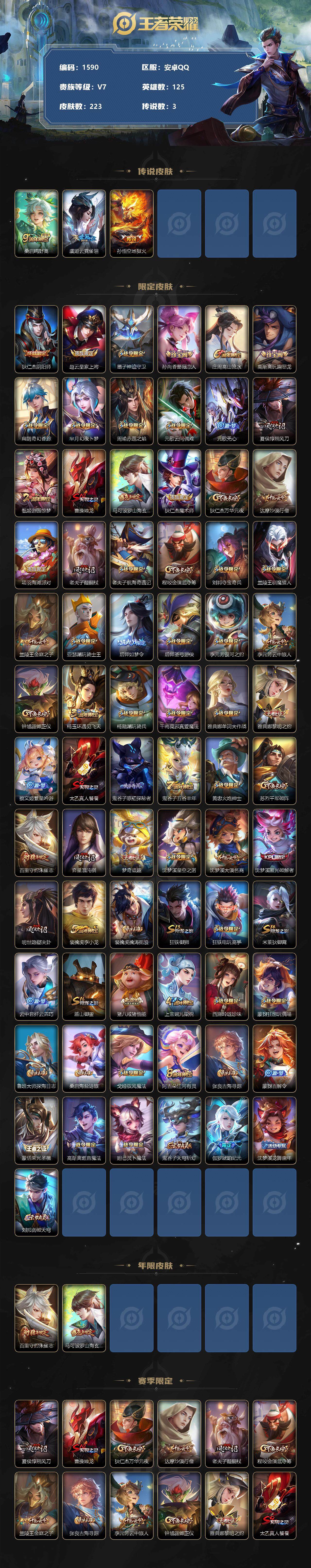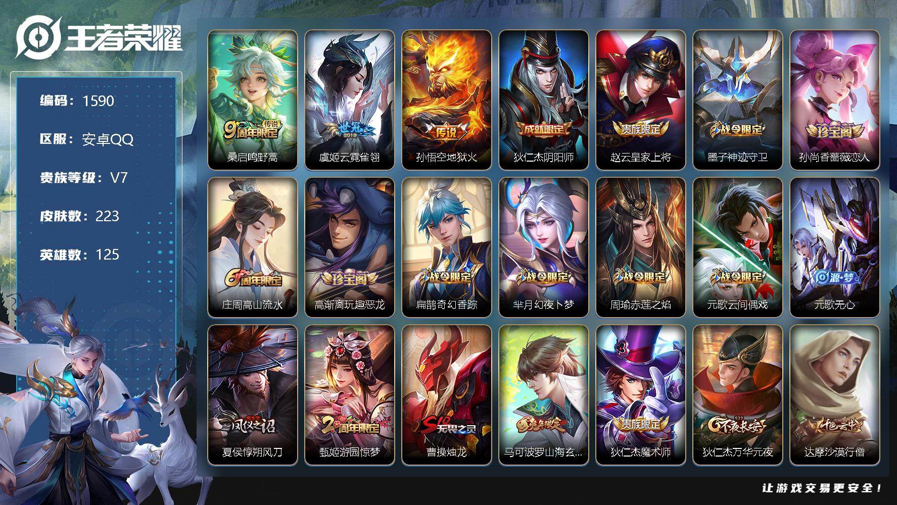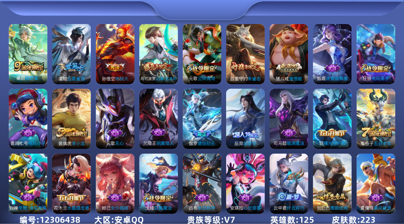 [12306438]【商品标题】:安卓Q-V0-永恒钻石V段位-125英雄-223皮肤-0典藏-0珍品无双-0无双-0珍品传说-3传说-64史诗