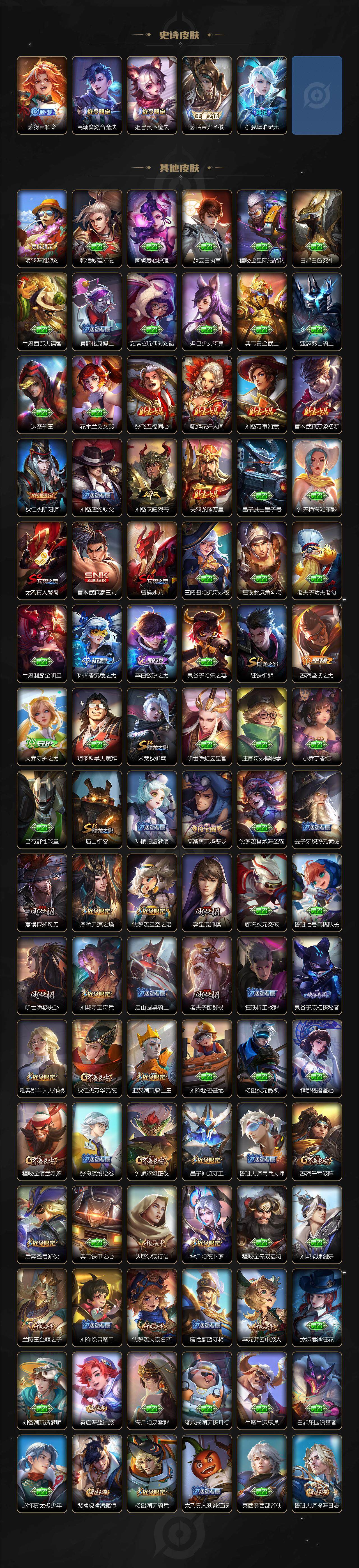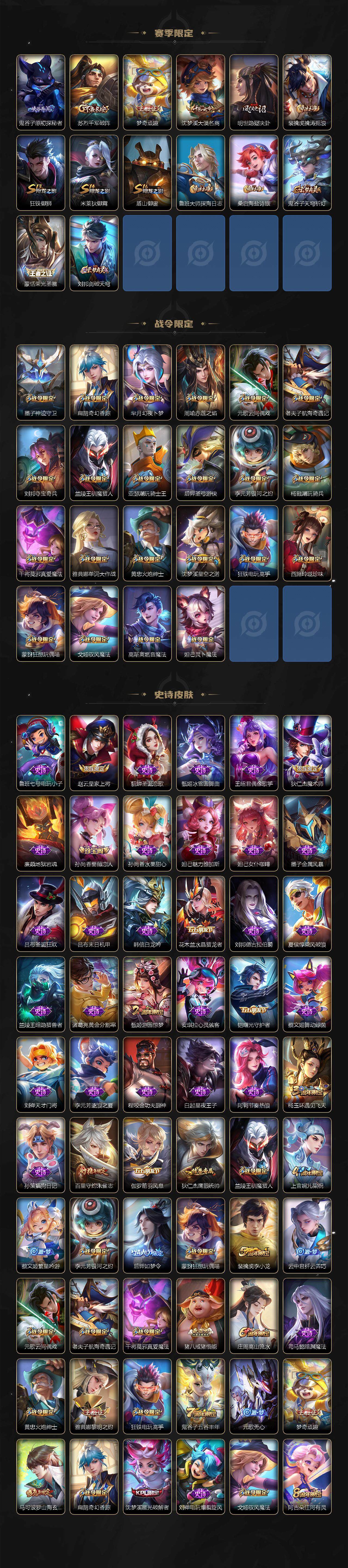 【限定皮肤】:狄仁杰阴阳师,赵云皇家上将,墨子神迹守卫,孙尚香蔷薇恋人,庄周高山流水,高渐离玩趣恶龙,扁鹊奇幻香踪,芈月幻夜卜梦,周瑜赤莲之焰,元歌云间偶戏,元歌无心,夏侯惇朔风刀,甄姬游园惊梦,曹操烛龙,马可波罗山海玄木吟,狄仁杰魔术师,狄仁杰万华元夜,达摩沙漠行僧,项羽海滩派对,老夫子醍醐杖,老夫子航海奇遇记,程咬金演武夺筹,刘邦夺宝奇兵,兰陵王驯魔猎人,兰陵王金庭之子,亚瑟潮玩骑士王,后羿如梦令,后羿圣弓游侠,李元芳银河之约,李元芳云中旅人,钟馗驱傩正仪,杨玉环遇见飞天,杨戬潮玩骑兵,干将莫邪真爱魔法,雅典娜单词大作战,雅典娜黎明之约,蔡文姬繁星吟游,太乙真人饕餮,鬼谷子原初探秘者,鬼谷子五谷丰年,黄忠火炮绅士,苏烈千军破阵,百里守约朱雀志,弈星混沌棋,梦奇顽趣,沈梦溪星空之诺,沈梦溪大漠名商,沈梦溪匿光破解者,明世隐疑决卦,裴擒虎李小龙,裴擒虎擒涛扼浪,狂铁御狮,狂铁电玩高手,米莱狄御霄,云中君纤云弄巧,盾山御銮,猪八戒猪悟能,上官婉儿梁祝,西施玲珑珍味,蒙犽狂想玩偶喵,鲁班大师探海日志,桑启海盐诗旅,戈娅驭风魔法,阿古朵江河有灵,张良古海寻踪,蒙犽百解令,蒙恬荣光圣徽,高渐离燃音魔法,妲己灵卜魔法,鬼谷子天穹祈灯,伽罗琥珀纪元,沈梦溪龙舞盛年,刘邦剑破天穹