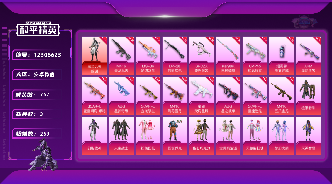 [12306623]1红装 20粉装 16特效枪 3载具 9印记 可二次 可修改实名 安全保护中 身法装备:赤蝎幽灵,都市猎人,舞王派对(派对舞王、小金鞋),暗影哥特(红眼罩),冥河战士(老木乃伊),零号机款机体服(黄螳螂),初号机 觉醒Ver.(新紫螳螂),Mark.06(新蓝螳螂) 优质装备:一级墨龙九天-敖渊(1级敖渊1级野人),墨龙九天-敖渊(野人),冥河战士(老木乃伊),木乃伊套装(老)(冥河战士),怪诞乔克(小丑),护世瑞兽,零号机款机体服(黄螳螂),甜心巧克力,焰龙咆哮,舞王派对(派对舞王、小金鞋),赤蝎幽灵,都市猎人,枪皮-星际漫游M416,M416五爪金龙,奇异狩猎者,梦幻火箭(新101)(新火箭少女101粉色套装),极限特训,幻影战神,未来战士,宝贝奶油派,天使彩虹糖,粉色回忆,SCAR-L童趣迷兔,天禅智恒,绚金战神,炙焰红王,冰霜白皇,新星烈龙(小白龙),童趣迷兔,星之彼岸,AUG星之彼岸,UMP45相思残雪(UMP45-相思残雪),M416风花雪月,AKM星际浪客,M416墨龙九天,六级M416-墨龙九天,AUG星梦奇缘,GROZA-镜光银凌,SCAR-L金蛇镇世,星穹咏叹调,烟雾弹-电雾迷城,蜜獾-荧海星豚,Kar98K-巳巳如意 热门装扮:吟月归客,初号机 觉醒Ver.(新紫螳螂),暗夜行者,兔兔白日梦,萌神柯基,激萌罗小黑,潮萌小黄鸭,迅捷狂鲨,王子的夏天,呆萌铁蟹,都市猎人,好奇恐龙,派对舞王(小金鞋),赤蝎幽灵 载具:疾风龙骑 稀有枪皮:MG-36-沧焰双生,SCAR-L-魔童闹海 哪吒,DP-28-豹影疾电 五级特效枪:五级GROZA-镜光银凌,五级Kar98K-巳巳如意,五级烟雾弹-电雾迷城,五级DP-28-豹影疾电,五级MG-36-沧焰双生,五级UMP45-相思残雪 四级特效枪:四级AKM-星际浪客 三级特效枪:三级AUG-星梦奇缘,三级SCAR-L金蛇镇世,三级SCAR-L-魔童闹海 哪吒,三级M416-风花雪月 二级特效枪:二级蜜獾-荧海星豚 一级特效枪:一级M416-五爪金龙,一级SCAR-L-童趣迷兔,一级AUG-星之彼岸 紫色装扮:霓虹热舞,SS31特训套装,SS30特训套装,SS23特训,云朵鹅,彩虹兔,雪绒豹,SS33特训套装,旭日情侣,顶瓜瓜,幻彩翩翩,照水倚天,田园牧歌,轻风白浪,和煦暖阳,SS22特训,妙红点点,