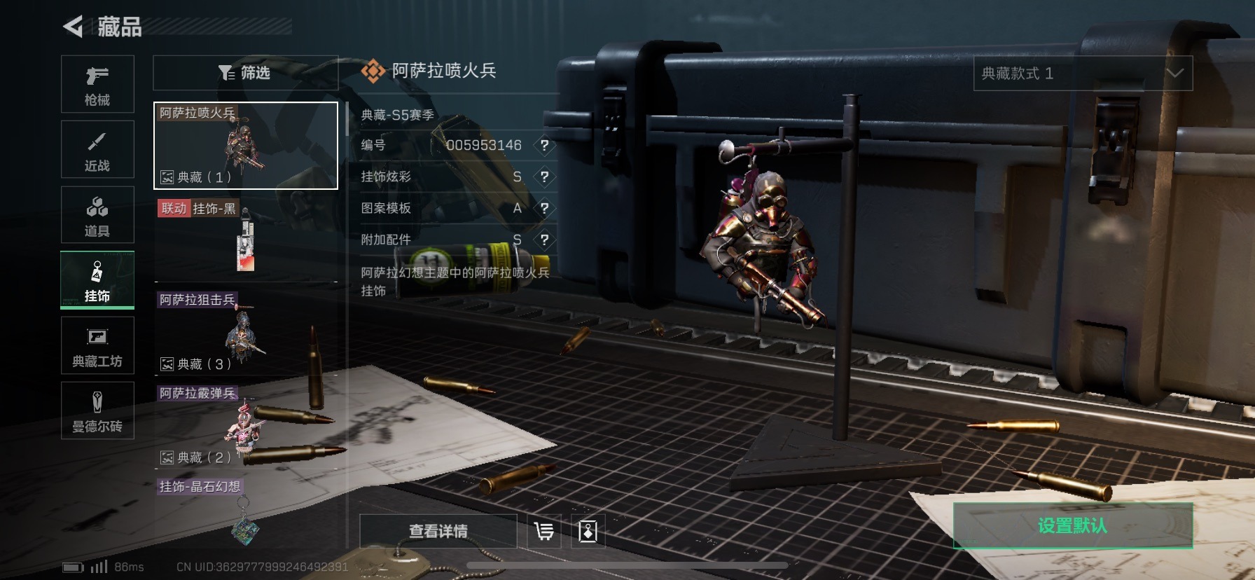 [12301143]总资产:114.9M 3传说枪械 哈夫币:100K 可二次 可修改实名 烽火地带段位:黄金 全面战场段位:无段位 传说武器皮肤:725双管霰弹枪-送葬人-无题密令,CAR-15突击步枪-阿米娅,复合弓-黑-天际线 史诗武器皮肤:SV-98狙击步枪-林中猎手,PKM通用机枪-荒野求生,SR-3M紧凑突击步枪-荒野求生,PSG-1射手步枪-无垢,M700狙击步枪-竞技风