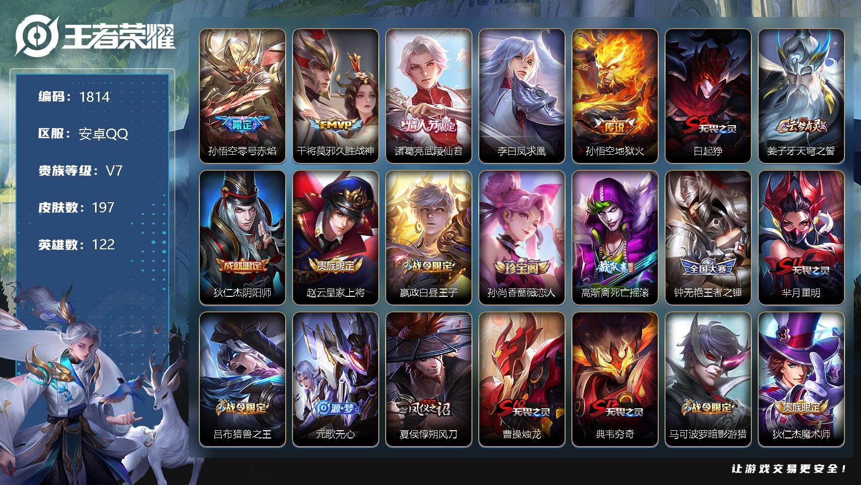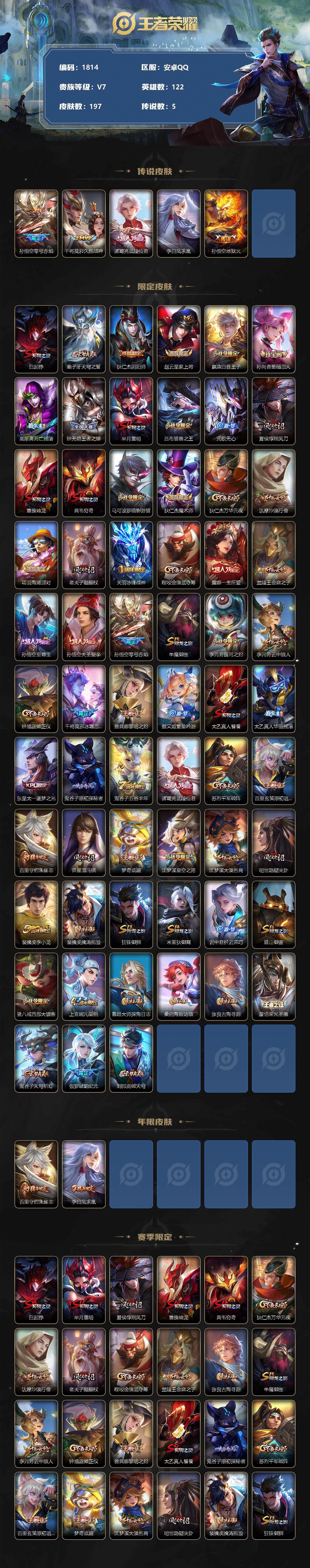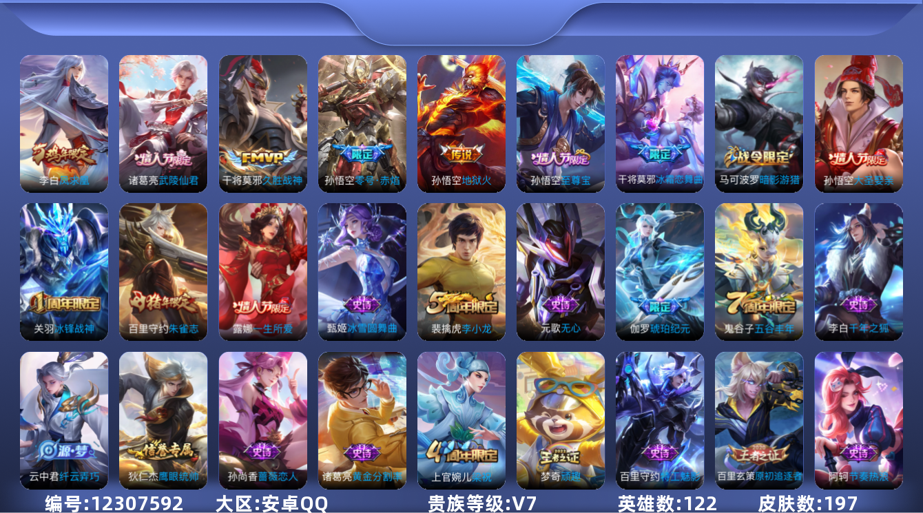 [12307592]【商品标题】:安卓Q-V0-荣耀黄金II段位-122英雄-197皮肤-0典藏-0珍品无双-0无双-0珍品传说-5传说-43史诗