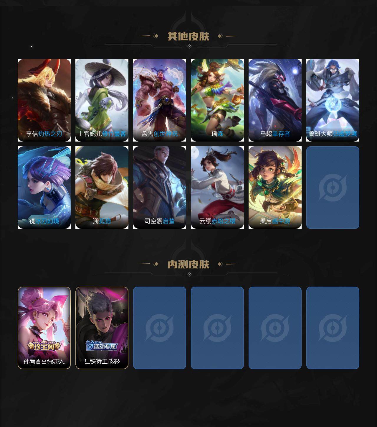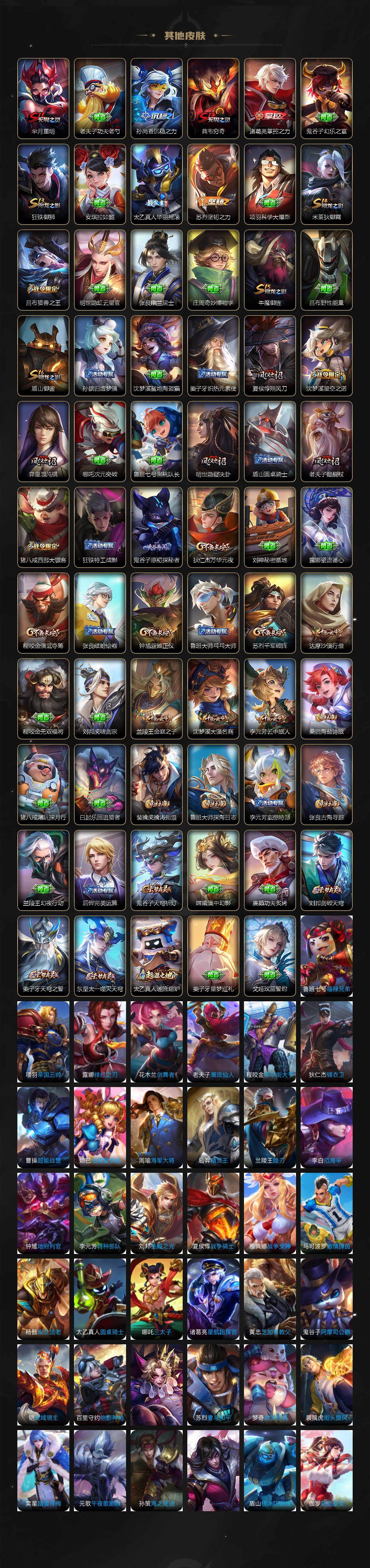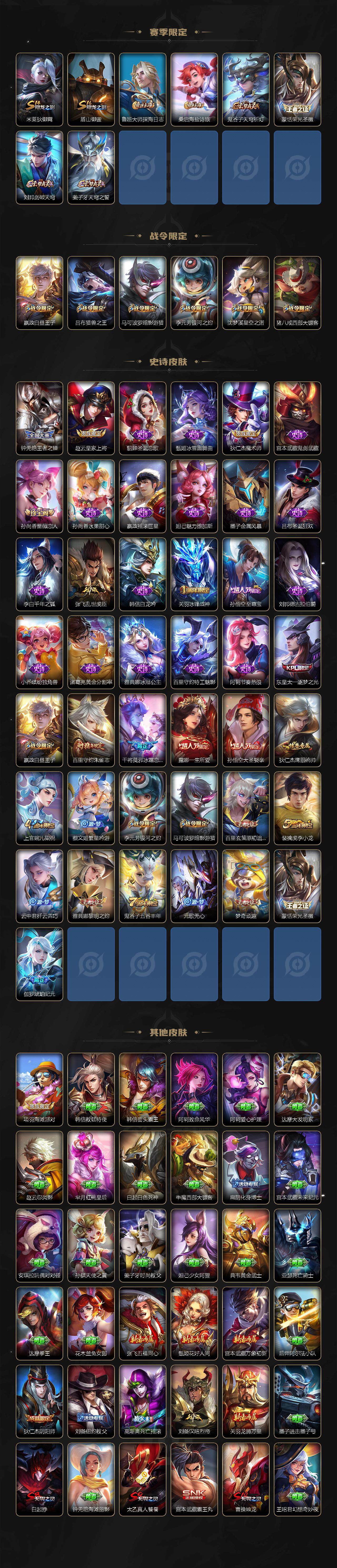 【限定皮肤】:白起狰,姜子牙天穹之誓,狄仁杰阴阳师,赵云皇家上将,嬴政白昼王子,孙尚香蔷薇恋人,高渐离死亡摇滚,钟无艳王者之锤,芈月重明,吕布猎兽之王,元歌无心,夏侯惇朔风刀,曹操烛龙,典韦穷奇,马可波罗暗影游猎,狄仁杰魔术师,狄仁杰万华元夜,达摩沙漠行僧,项羽海滩派对,老夫子醍醐杖,关羽冰锋战神,程咬金演武夺筹,露娜一生所爱,兰陵王金庭之子,孙悟空至尊宝,孙悟空大圣娶亲,孙悟空零号赤焰,牛魔御旌,李元芳银河之约,李元芳云中旅人,钟馗驱傩正仪,干将莫邪冰霜恋舞曲,雅典娜黎明之约,蔡文姬繁星吟游,太乙真人饕餮,太乙真人华丽摇滚,东皇太一逐梦之光,鬼谷子原初探秘者,鬼谷子五谷丰年,诸葛亮武陵仙君,苏烈千军破阵,百里玄策原初追逐者,百里守约朱雀志,弈星混沌棋,梦奇顽趣,沈梦溪星空之诺,沈梦溪大漠名商,明世隐疑决卦,裴擒虎李小龙,裴擒虎擒涛扼浪,狂铁御狮,米莱狄御霄,云中君纤云弄巧,盾山御銮,猪八戒西部大镖客,上官婉儿梁祝,鲁班大师探海日志,桑启海盐诗旅,张良古海寻踪,蒙恬荣光圣徽,鬼谷子天穹祈灯,伽罗琥珀纪元,刘邦剑破天穹