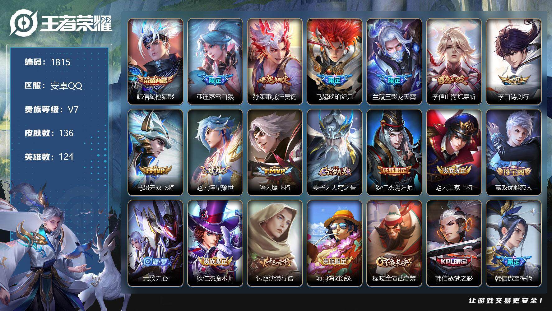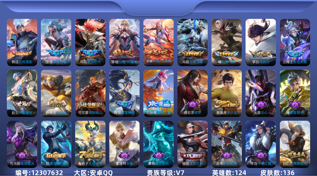 [12307632]【商品标题】:安卓Q-V0-至尊星耀IV段位-124英雄-136皮肤-1典藏-0珍品无双-0无双-0珍品传说-9传说-39史诗