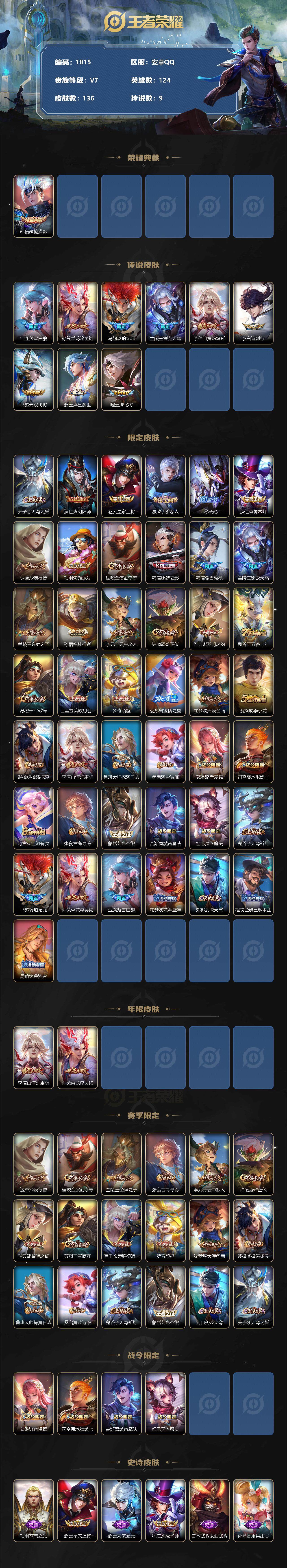 - PX_2099942-72 安卓QQ/至尊星耀/293皮肤/125英雄/1典藏/0珍品无双/0无双/2珍品传说/21传说/77史诗/10稀有英雄 【2 珍品传说】怪盗基德 马可波罗,江户川柯南 鲁班七号, 【1 典藏皮肤】无限飓风号 夏侯惇, 【21 传说皮肤】武圣 关羽,启明星使 虞姬,零号·赤焰 孙悟空,地狱火 孙悟空,齐天大圣 孙悟空,永曜之星 杨戬,凤求凰 李白,诗剑行 李白,黄金射手座