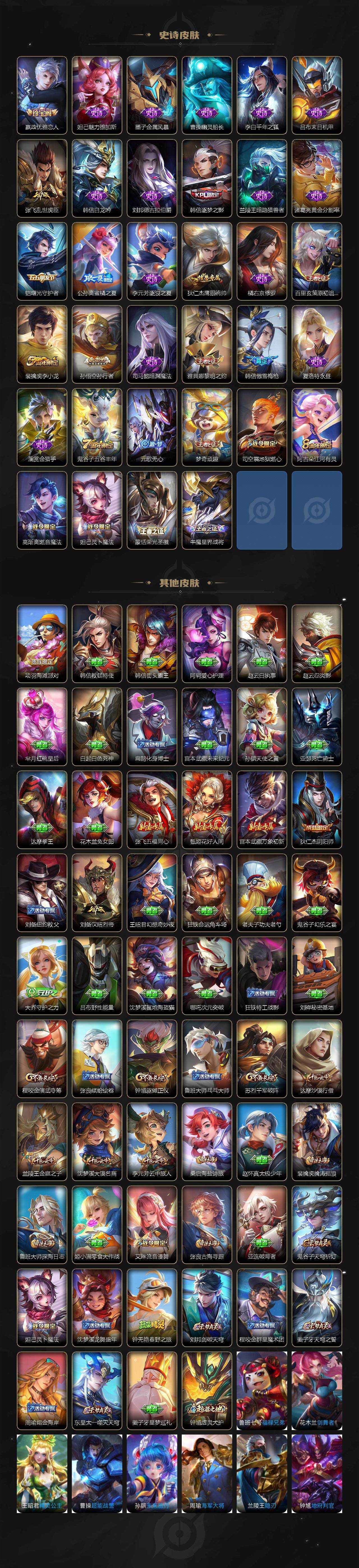 【史诗皮肤】:项羽苍穹之光,赵云皇家上将,赵云未来纪元,狄仁杰魔术师,宫本武藏鬼剑武藏,孙尚香水果甜心,嬴政优雅恋人,妲己魅力维加斯,墨子金属风暴,曹操幽灵船长,李白千年之狐,吕布末日机甲,张飞乱世虎臣,韩信白龙吟,刘邦德古拉伯爵,韩信逐梦之影,兰陵王暗隐猎兽者,诸葛亮黄金分割率,铠曙光守护者,公孙离蜜橘之夏,李元芳逐浪之夏,狄仁杰鹰眼统帅,橘右京修罗,百里玄策原初追逐者,裴擒虎李小龙,孙悟空孙行者,司马懿暗渊魔法,雅典娜黎明之约,韩信傲雪梅枪,夏洛特永昼,澜赏金猎手,鬼谷子五谷丰年,元歌无心,梦奇顽趣,司空震地狱燃心,阿古朵江河有灵,妲己灵卜魔法,高渐离燃音魔法,蒙恬荣光圣徽,牛魔星界战将