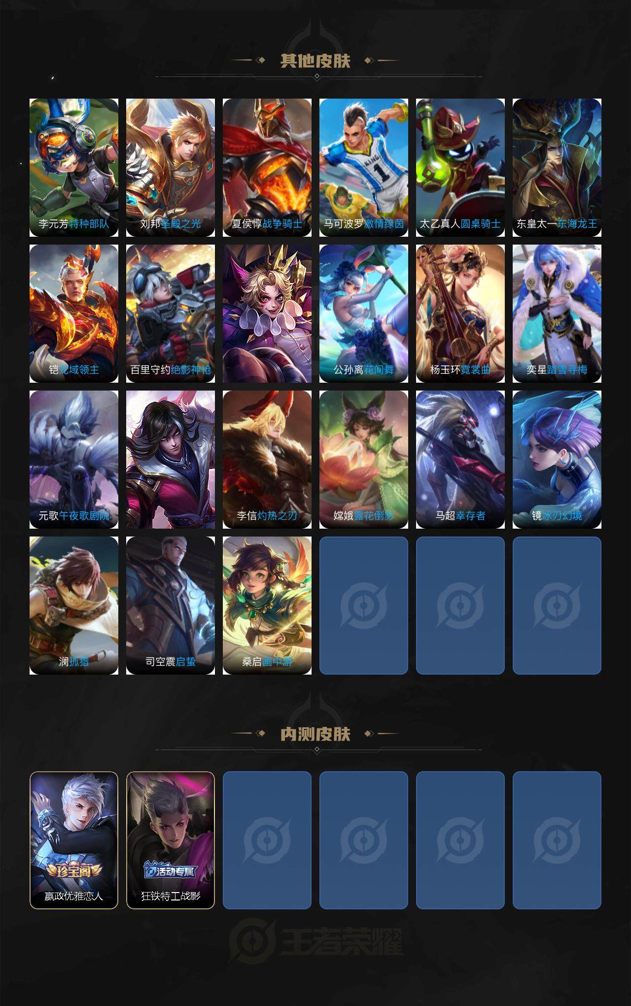 李元芳逐浪之夏,诸葛亮黄金分割率,韩信白龙吟,项羽苍穹之光,吕布末日机甲,橘右京修罗,刘邦德古拉伯爵,兰陵王暗隐猎兽者,曹操幽灵船长,宫本武藏鬼剑武藏,司马懿暗渊魔法,铠曙光守护者,墨子金属风暴,百里玄策原初追逐者,雅典娜黎明之约,李白千年之狐,夏洛特永昼,澜赏金猎手,高渐离燃音魔法