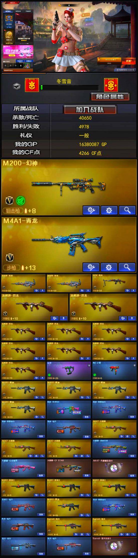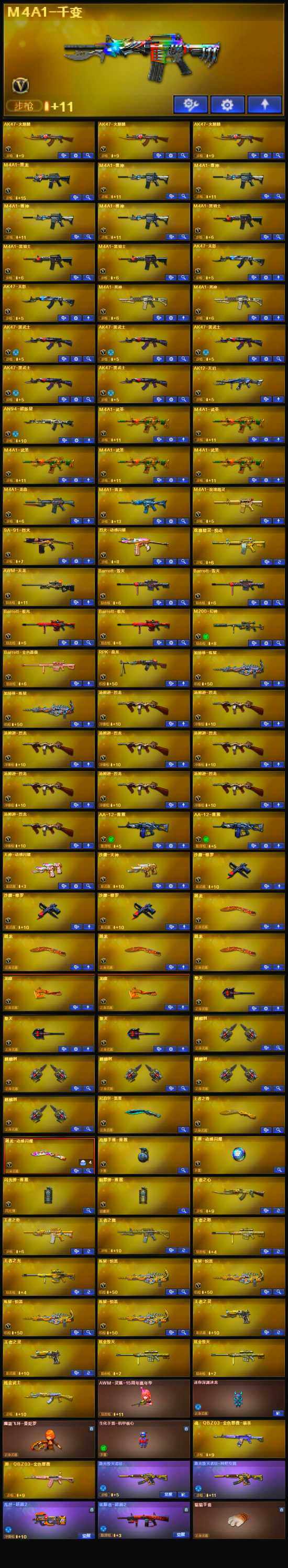 【英雄级武器】:M4A1-武圣*5,烈火-动感闪耀,天神-动感闪耀,屠龙-动感闪耀,手雷-动感闪耀,M4A1-青龙,M4A1-雷神*4,M4A1-黑龙,M4A1-玫瑰精灵,M4A1-黑骑士*3,M4A1-死神*2,RPK-盘龙,加特林-炼狱*2,汤姆逊-烈龙*9,AK47-无影*2,AK47-火麒麟*3,AK47-黑武士*5,AK12-天启,AN94-超新星,AWM-天龙,Barrett-毁灭*2,Barrett-极光*2,M4A1-龙血,AA-12-雷霆*2,M200-幻神,M4A1-千变,沙鹰-天神,沙鹰-修罗*3,麒麟刺*5,擎天*3,龙啸*2,屠龙*4
