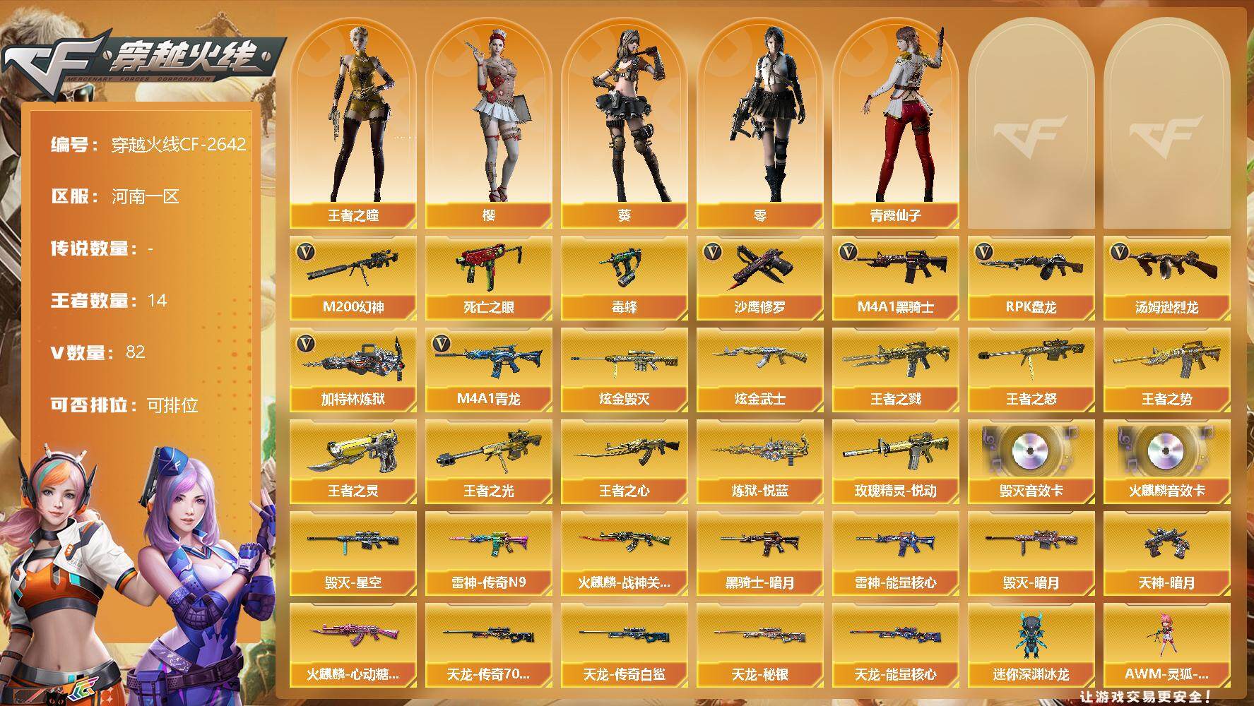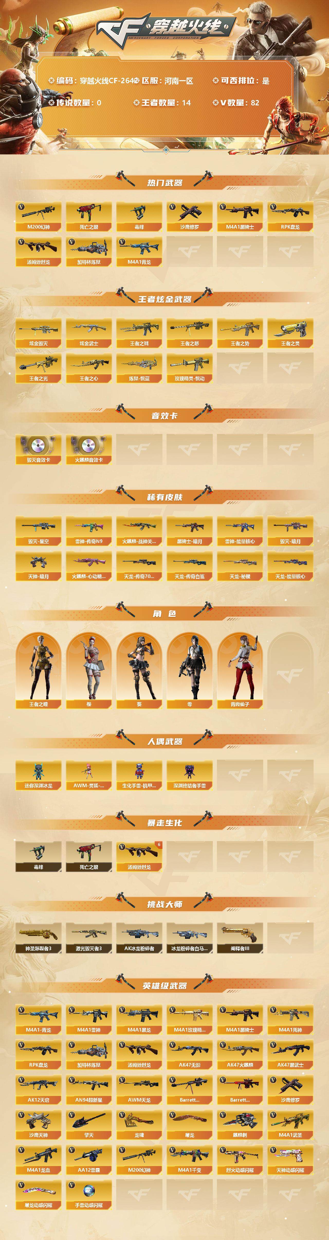 [12307672]【商品标题】:河南一区-82V-14王者-3炫金 【热门武器】:M4A1-青龙,M200-幻神,死亡之眼,毒蜂,M4A1-黑骑士*3,汤姆逊-烈龙*9,RPK-盘龙,加特林-炼狱*2,沙鹰-修罗*3 【王者炫金武器】:炫金毁灭*2,炫金武士,炼狱-悦蓝*4,王者之戮,王者之势,玫瑰精灵-悦动,王者之光,王者之怒,王者之心,王者之灵*2 【音效卡】:AK47-火麒麟音效卡,Barrett-毁灭音效卡 【稀有皮肤】:雷神-能量核心*2,雷神-传奇N9,火麒麟-战神关羽,火麒麟-心动糖果,黑骑士-暗月,毁灭-暗月,毁灭-星空,天龙-秘银,天龙-能量核心,AWM-天龙-传奇70KG,AWM-天龙-传奇白鲨,天神-暗月 【角色】:王者之瞳,零,葵,樱,青霞仙子 【人偶武器】:AWM-灵狐-15周年嘉年华,迷你深渊冰龙,生化手雷-机甲核心,深渊终结者手雷 【暴走生化】:毒蜂,死亡之眼 【挑战大师】:神圣爆裂者III,阐释者III,激光毁灭者III,AK47-冰龙粉碎者,冰龙粉碎者-白马银枪 【英雄级武器】:M4A1-武圣*5,烈火-动感闪耀,天神-动感闪耀,屠龙-动感闪耀,手雷-动感闪耀,M4A1-青龙,M4A1-雷神*4,M4A1-黑龙,M4A1-玫瑰精灵,M4A1-黑骑士*3,M4A1-死神*2,RPK-盘龙,加特林-炼狱*2,汤姆逊-烈龙*9,AK47-无影*2,AK47-火麒麟*3,AK47-黑武士*5,AK12-天启,AN94-超新星,AWM-天龙,Barrett-毁灭*2,Barrett-极光*2,M4A1-龙血,AA-12-雷霆*2,M200-幻神,M4A1-千变,沙鹰-天神,沙鹰-修罗*3,麒麟刺*5,擎天*3,龙啸*2,屠龙*4 【特殊枪械】:3黑骑士,6烈龙,1盘龙,2炼狱