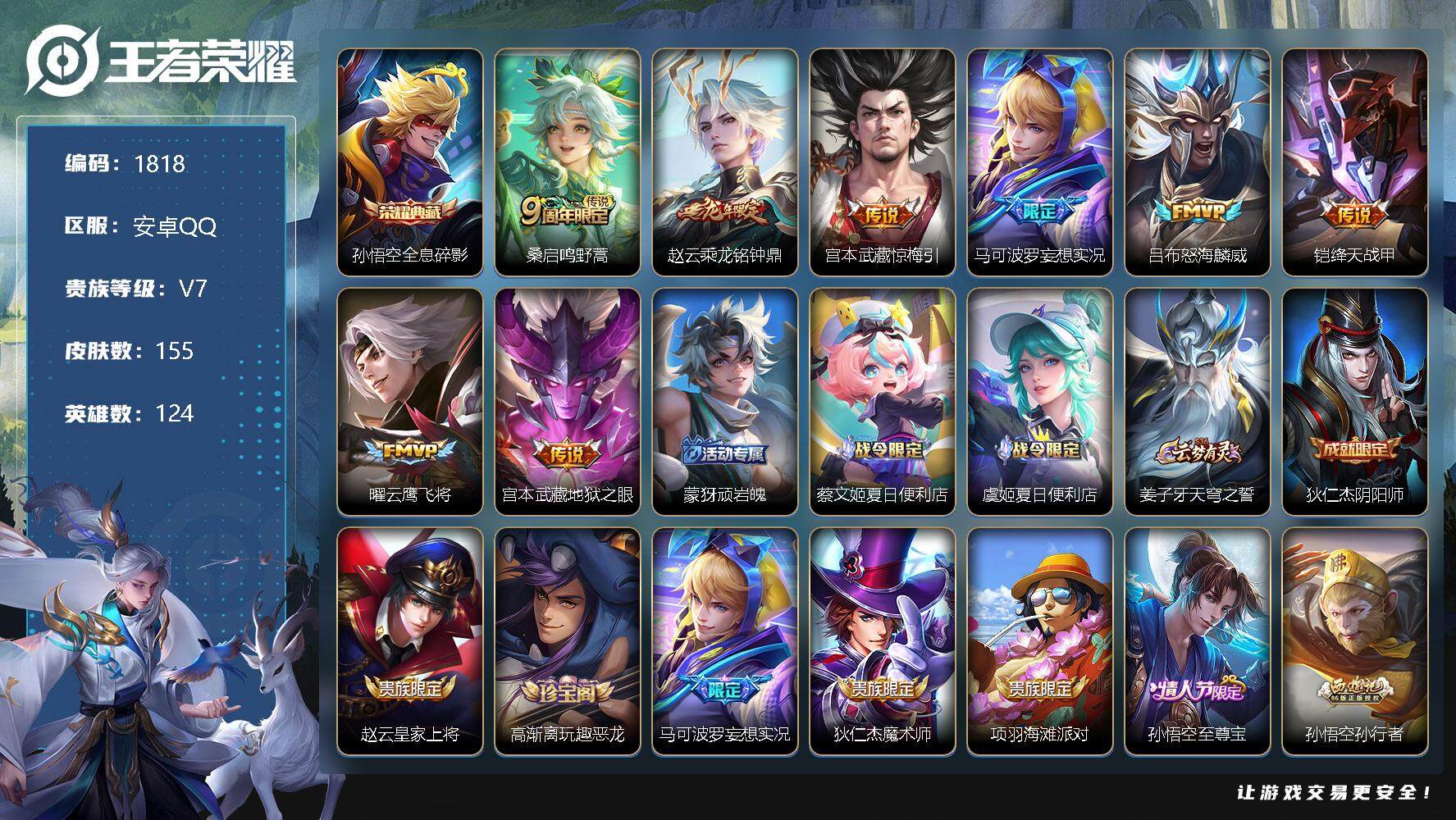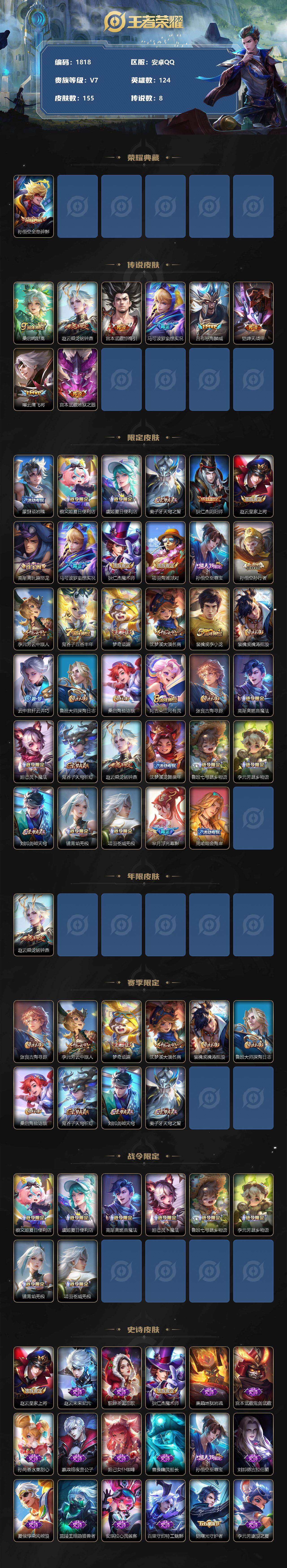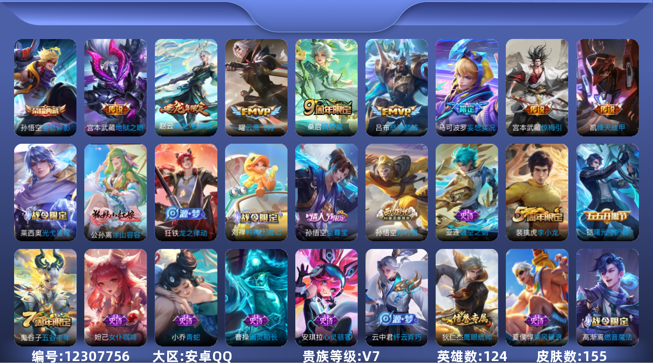 [12307756]【商品标题】:安卓Q-V7-永恒钻石II段位-124英雄-155皮肤-1典藏-0珍品无双-0无双-0珍品传说-8传说-40史诗