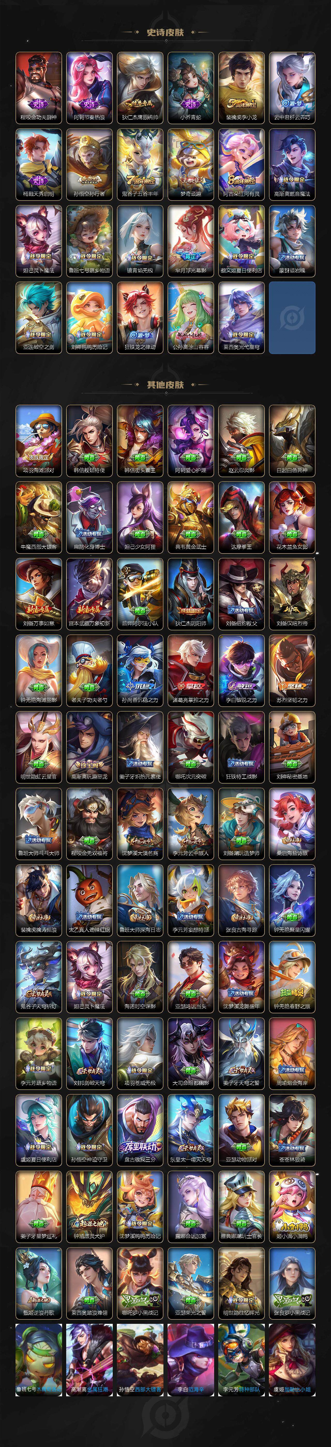 【史诗皮肤】:赵云皇家上将,赵云未来纪元,貂蝉圣诞恋歌,狄仁杰魔术师,廉颇地狱岩魂,宫本武藏鬼剑武藏,孙尚香水果甜心,嬴政暗夜贵公子,妲己女仆咖啡,曹操幽灵船长,孙悟空至尊宝,刘邦德古拉伯爵,夏侯惇乘风破浪,兰陵王暗隐猎兽者,安琪拉心灵骇客,百里守约特工魅影,铠曙光守护者,李元芳逐浪之夏,程咬金功夫厨神,阿轲节奏热浪,狄仁杰鹰眼统帅,小乔青蛇,裴擒虎李小龙,云中君纤云弄巧,杨戬天秀启明,孙悟空孙行者,鬼谷子五谷丰年,梦奇顽趣,阿古朵江河有灵,妲己灵卜魔法,高渐离燃音魔法,鲁班七号蔬乡物语,镜青焰无极,芈月浮光幕影,蔡文姬夏日便利店,蒙犽顽岩魄,亚连破空之剑,刘禅鸭鸭历险记,狂铁龙之律动,公孙离涂山容容,莱西奥光弋星穹