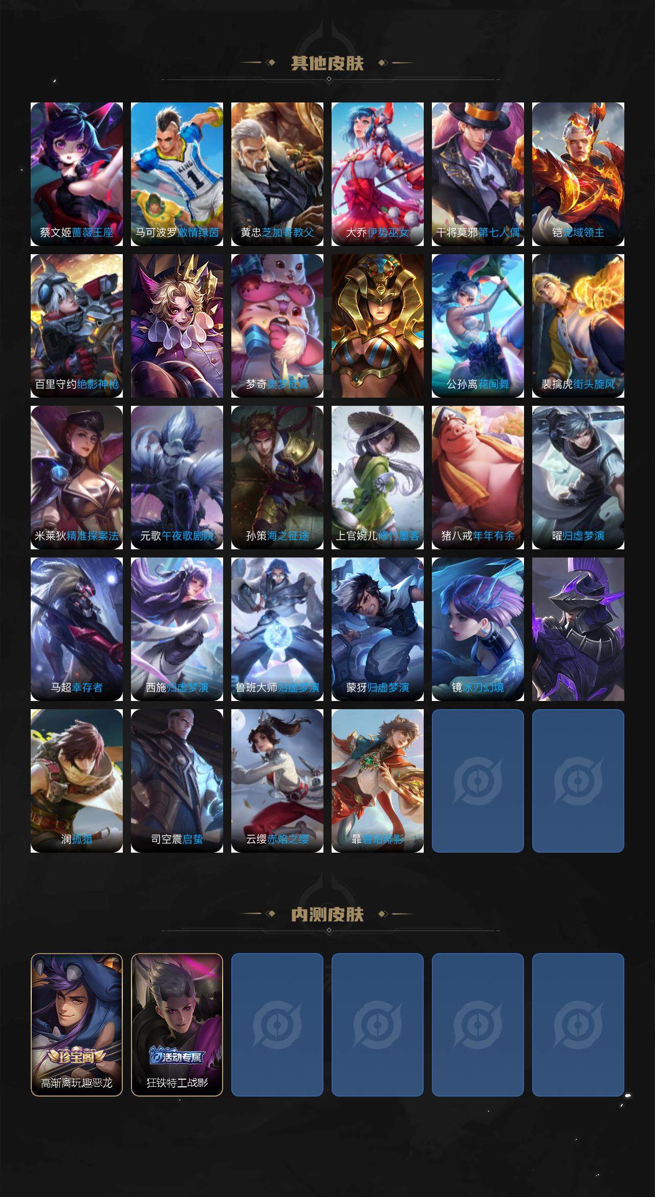 【赛季限定】:张良古海寻踪,李元芳云中旅人,梦奇顽趣,沈梦溪大漠名商,裴擒虎擒涛扼浪,鲁班大师探海日志,桑启海盐诗旅,鬼谷子天穹祈灯,刘邦剑破天穹,姜子牙天穹之誓