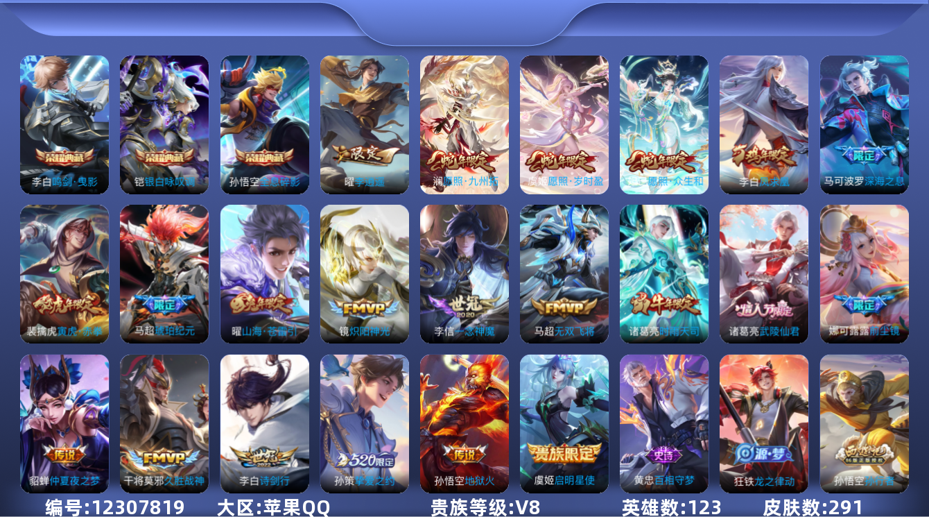 [12307819]【商品标题】:苹果Q-V8-最强王者段位-123英雄-291皮肤-3典藏-0珍品无双-0无双-0珍品传说-21传说-87史诗