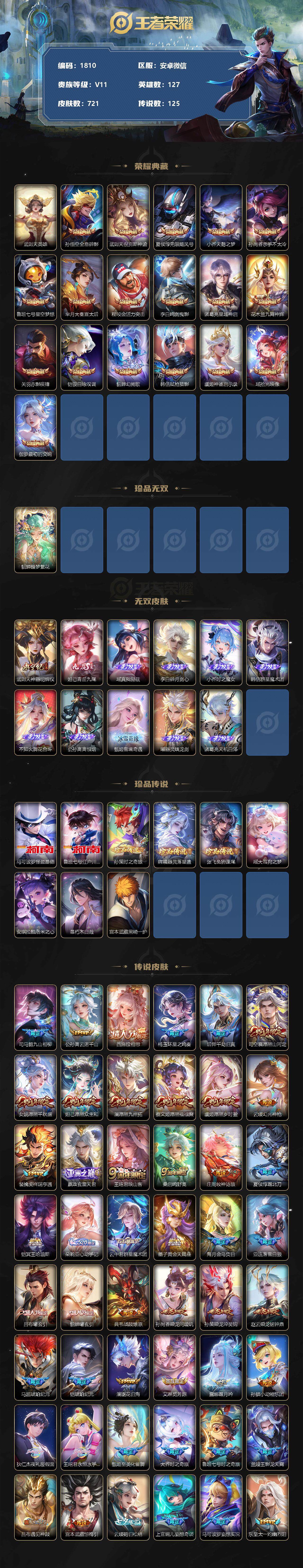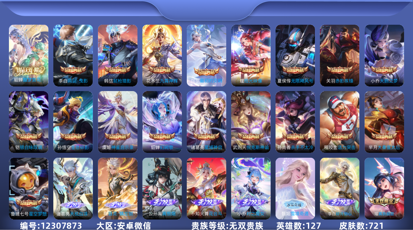 [12307873]【商品标题】:安卓WX-V11-2传说天幕-1小兵-至尊星耀III段位-127英雄-721皮肤-18典藏-1珍品无双-11无双-9珍品传说-125传说-259史诗