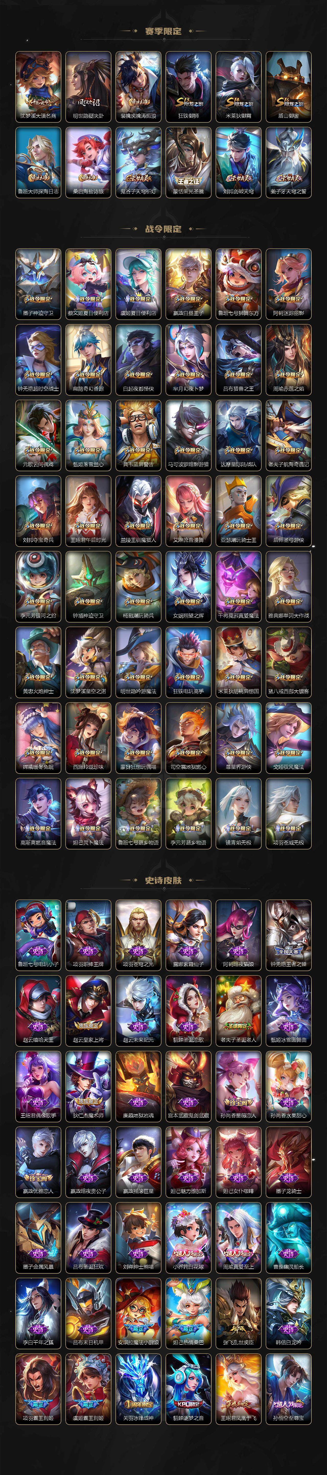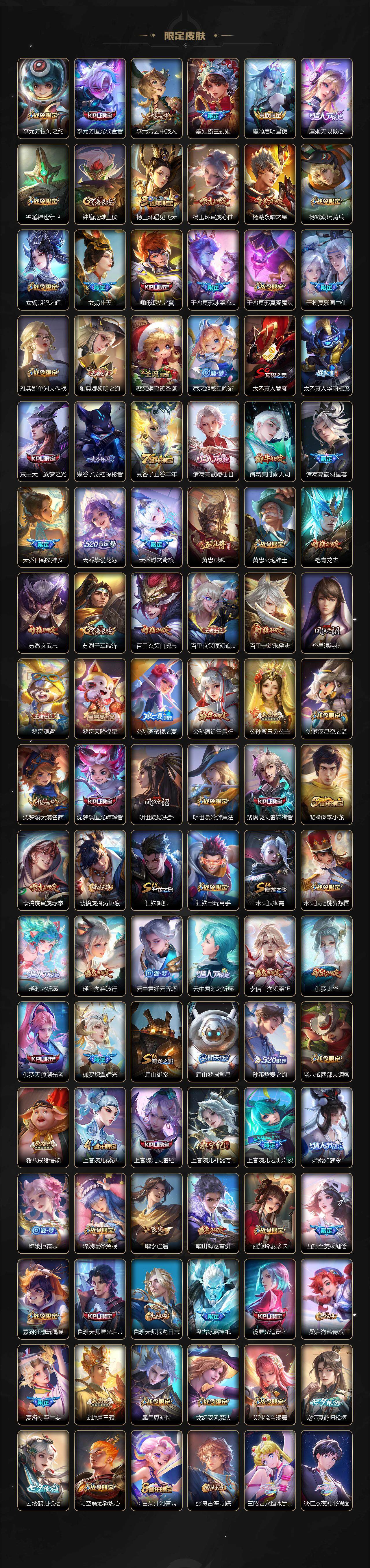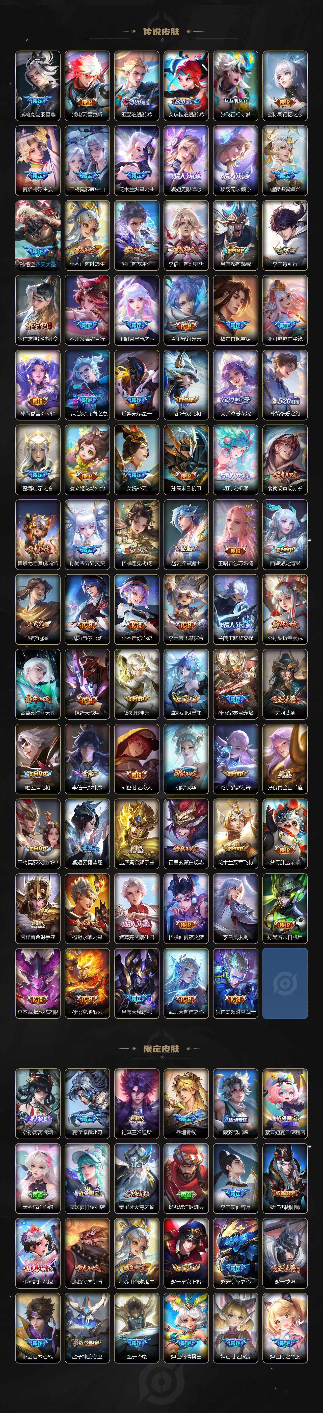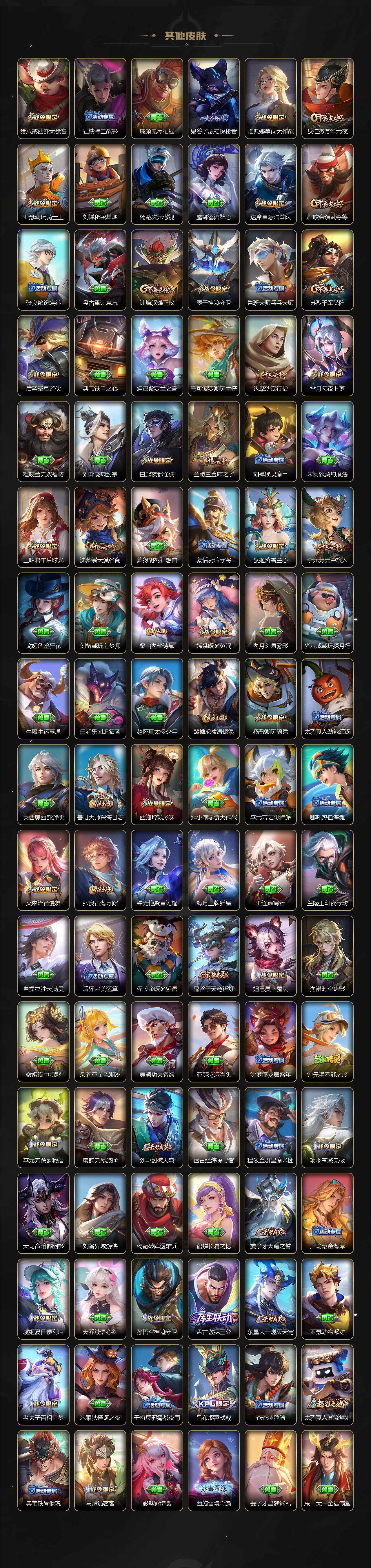 关羽冰锋战神,裴擒虎李小龙,上官婉儿梁祝,牛魔奔雷神使,貂蝉逐梦之音,公孙离祈雪灵祝,吕布御风骁将,诸葛亮时雨天司,赵云龙胆,关羽武圣,黄忠烈魂,张飞虎魄,马超神威,后羿辉光之辰,庄周玄嵩,典韦岱宗,甄姬幽恒,韩信飞衡,伽罗太华,曹操天狼征服者,裴擒虎天狼狩猎者,孙膑天狼运算者,上官婉儿天狼绘梦者,伽罗天狼溯光者,哪吒逐梦之翼,马可波罗逐梦之星,韩信逐梦之影,东皇太一逐梦之光,铠青龙志,百里玄策白虎志,花木兰瑞麟志,苏烈玄武志,百里守约朱雀志,王昭君凤凰于飞,项羽霸王别姬,虞姬霸王别姬,小乔纯白花嫁,周瑜真爱至上,孙悟空大圣娶亲,露娜一生所爱,花木兰默契交锋,兰陵王默契交锋,后羿如梦令,嫦娥如梦令,孙悟空至尊宝,裴擒虎梅西,雅典娜神奇女侠,妲己热情桑巴,干将莫邪冰霜恋舞曲,花木兰青春决赛季,蔡文姬奇迹圣诞,妲己时之彼端,公孙离蜜橘之夏,芈月白晶晶,安琪拉魔法小厨娘,赵云引擎之心,孙悟空美猴王,庄周云端筑梦师,鲁班七号乒乒小将,大乔白鹤梁神女,猪八戒猪悟能,廉颇寅虎·御盾,孙尚香异界灵契,老夫子圣诞老人,孙悟空孙行者,甄姬女儿国国王,镜匿光追影者,韩信傲雪梅枪,鲁班七号寅虎·瑞焰,孙膑寅虎·展翼,杨玉环寅虎·心曲,裴擒虎寅虎·赤拳,云中君时之祈愿,瑶时之祈愿,女娲补天,赵云百木心枪,公孙离玉兔公主,露娜启示之音,夏侯惇匿光决锋者,后羿无尽星芒,马可波罗深海之息,金蝉唐三藏,娜可露露前尘镜,橘右京枫霜尽,鲁班大师匿光启智者,妲己时之奇旅,王昭君星穹之声,不知火舞绯月行,上官婉儿神器·万象笔,盾山梦圆繁星,墨子降魔,李白诗剑行,马可波罗山海·玄木吟,盘古冰霜神祇,瑶山海·碧波行,兰陵王影龙天霄,西施至美·乘鲤谣,甄姬至美·化雀舞,夏侯惇霜北刀,桑启鸣野蒿,艾琳陌上桑,王昭君映山客,澜愿照·九州拓,蔡文姬愿照·福禄聚,虞姬愿照·岁时盈,司空震愿照·山河定,妲己愿照·众生和,女娲愿照·千秋盛