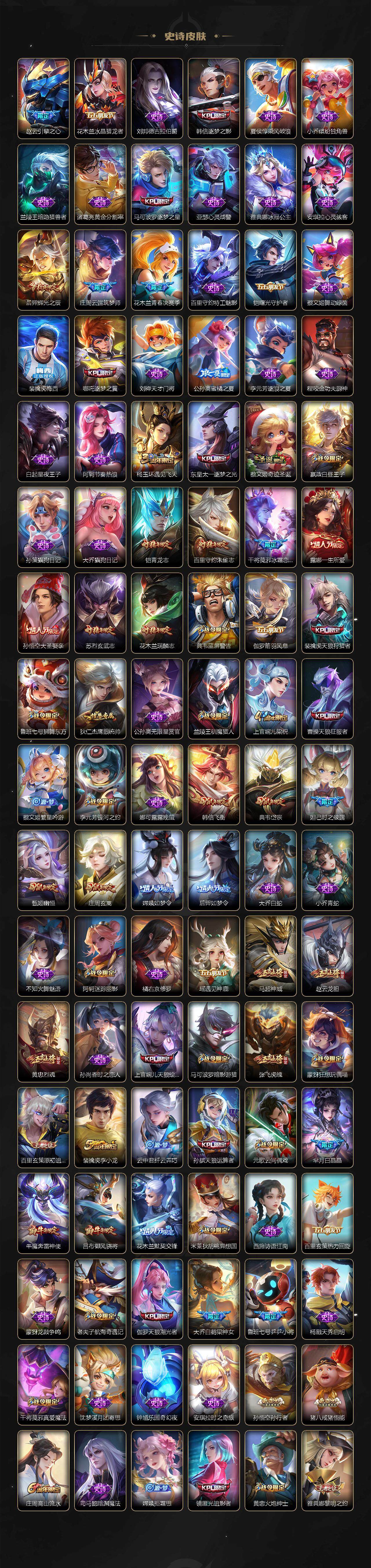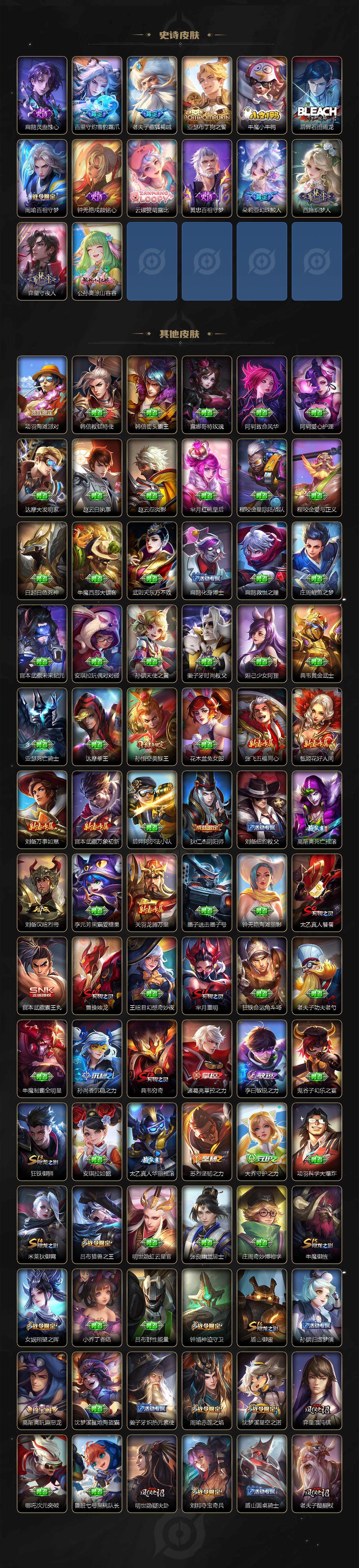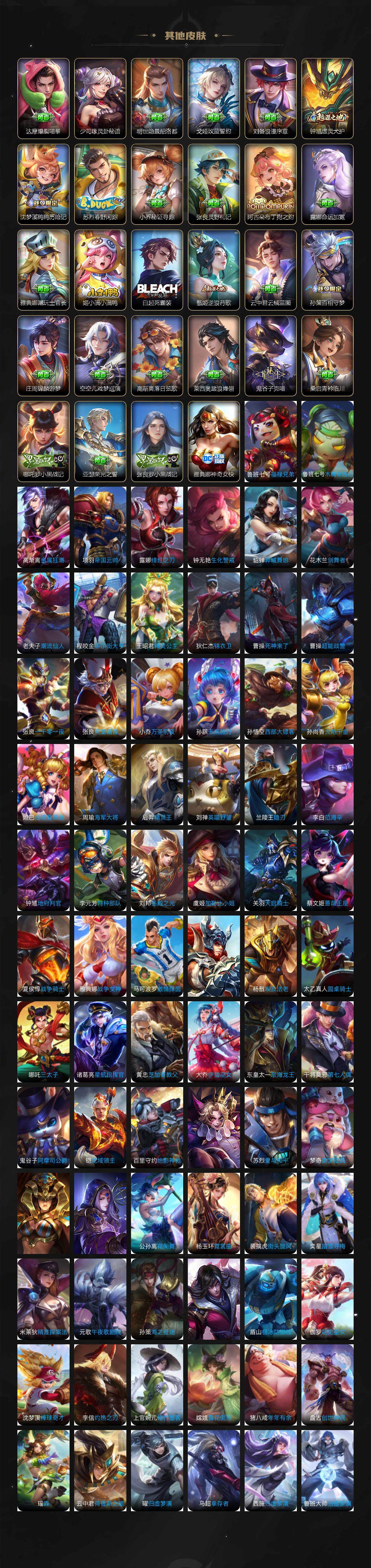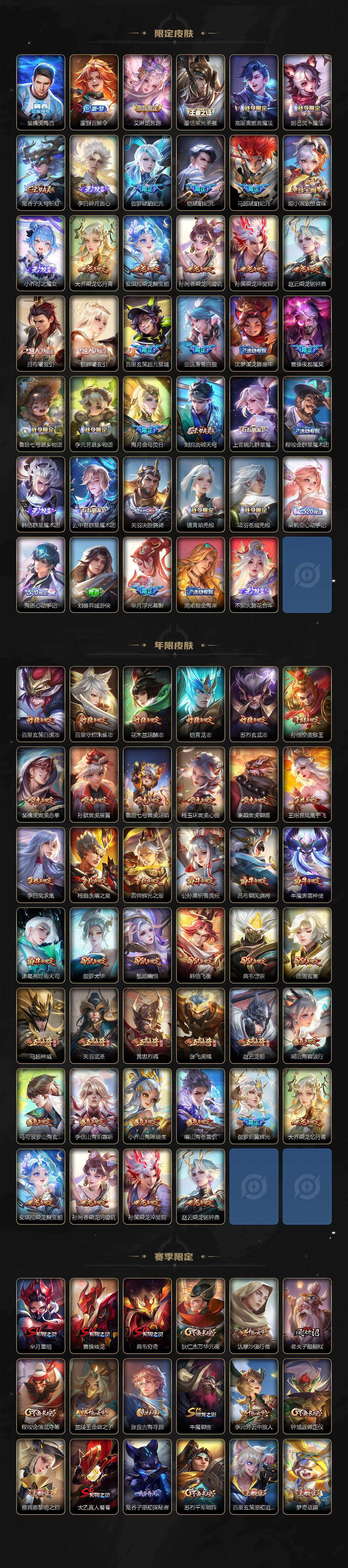 关羽冰锋战神,裴擒虎李小龙,上官婉儿梁祝,牛魔奔雷神使,貂蝉逐梦之音,公孙离祈雪灵祝,吕布御风骁将,诸葛亮时雨天司,赵云龙胆,关羽武圣,黄忠烈魂,张飞虎魄,马超神威,后羿辉光之辰,庄周玄嵩,典韦岱宗,甄姬幽恒,韩信飞衡,伽罗太华,曹操天狼征服者,裴擒虎天狼狩猎者,孙膑天狼运算者,上官婉儿天狼绘梦者,伽罗天狼溯光者,哪吒逐梦之翼,马可波罗逐梦之星,韩信逐梦之影,东皇太一逐梦之光,铠青龙志,百里玄策白虎志,花木兰瑞麟志,苏烈玄武志,百里守约朱雀志,王昭君凤凰于飞,项羽霸王别姬,虞姬霸王别姬,小乔纯白花嫁,周瑜真爱至上,孙悟空大圣娶亲,露娜一生所爱,花木兰默契交锋,兰陵王默契交锋,后羿如梦令,嫦娥如梦令,孙悟空至尊宝,裴擒虎梅西,雅典娜神奇女侠,妲己热情桑巴,干将莫邪冰霜恋舞曲,花木兰青春决赛季,蔡文姬奇迹圣诞,妲己时之彼端,公孙离蜜橘之夏,芈月白晶晶,安琪拉魔法小厨娘,赵云引擎之心,孙悟空美猴王,庄周云端筑梦师,鲁班七号乒乒小将,大乔白鹤梁神女,猪八戒猪悟能,廉颇寅虎·御盾,孙尚香异界灵契,老夫子圣诞老人,孙悟空孙行者,甄姬女儿国国王,镜匿光追影者,韩信傲雪梅枪,鲁班七号寅虎·瑞焰,孙膑寅虎·展翼,杨玉环寅虎·心曲,裴擒虎寅虎·赤拳,云中君时之祈愿,瑶时之祈愿,女娲补天,赵云百木心枪,公孙离玉兔公主,露娜启示之音,夏侯惇匿光决锋者,后羿无尽星芒,马可波罗深海之息,金蝉唐三藏,娜可露露前尘镜,橘右京枫霜尽,鲁班大师匿光启智者,妲己时之奇旅,王昭君星穹之声,不知火舞绯月行,上官婉儿神器·万象笔,盾山梦圆繁星,墨子降魔,李白诗剑行,马可波罗山海·玄木吟,盘古冰霜神祇,瑶山海·碧波行,兰陵王影龙天霄,西施至美·乘鲤谣,甄姬至美·化雀舞,夏侯惇霜北刀,桑启鸣野蒿,艾琳陌上桑,王昭君映山客,澜愿照·九州拓,蔡文姬愿照·福禄聚,虞姬愿照·岁时盈,司空震愿照·山河定,妲己愿照·众生和,女娲愿照·千秋盛