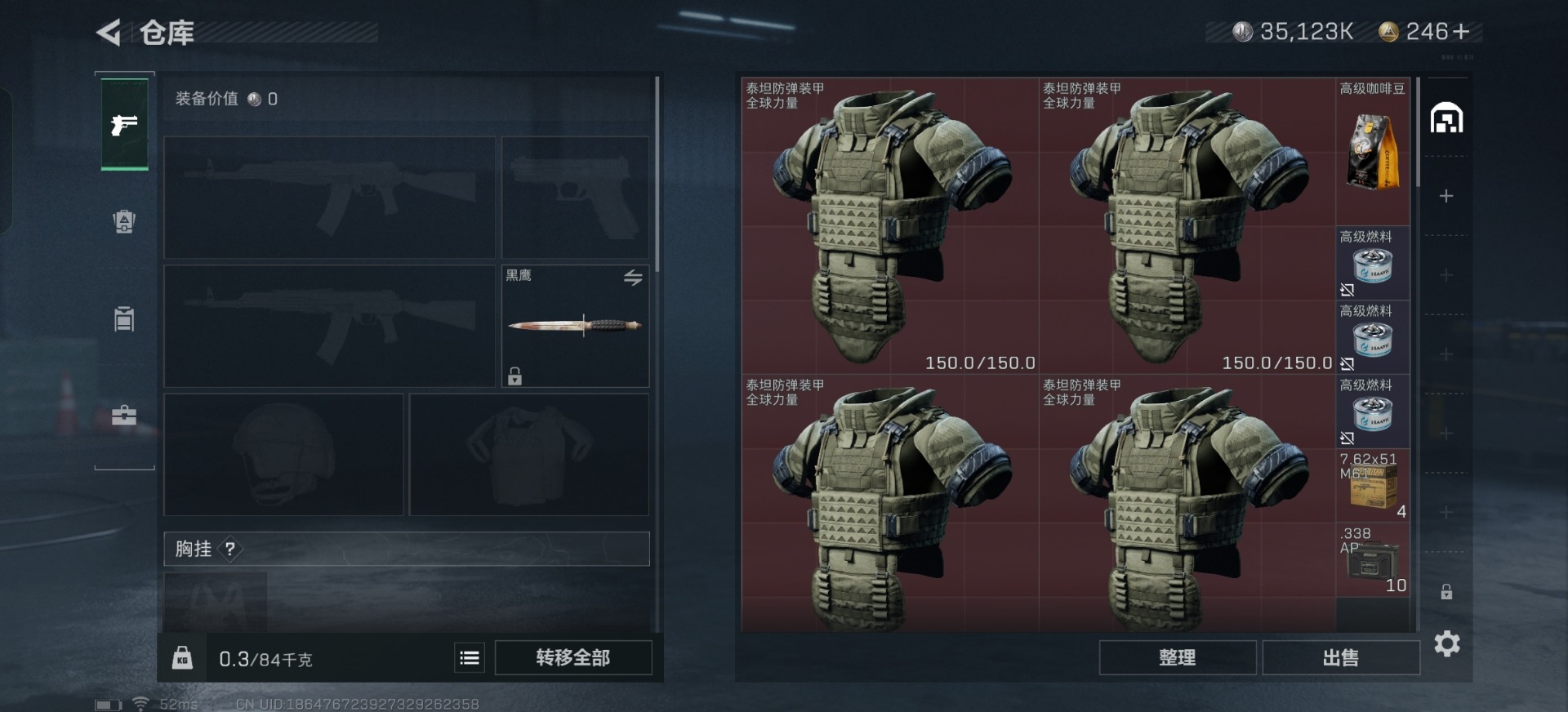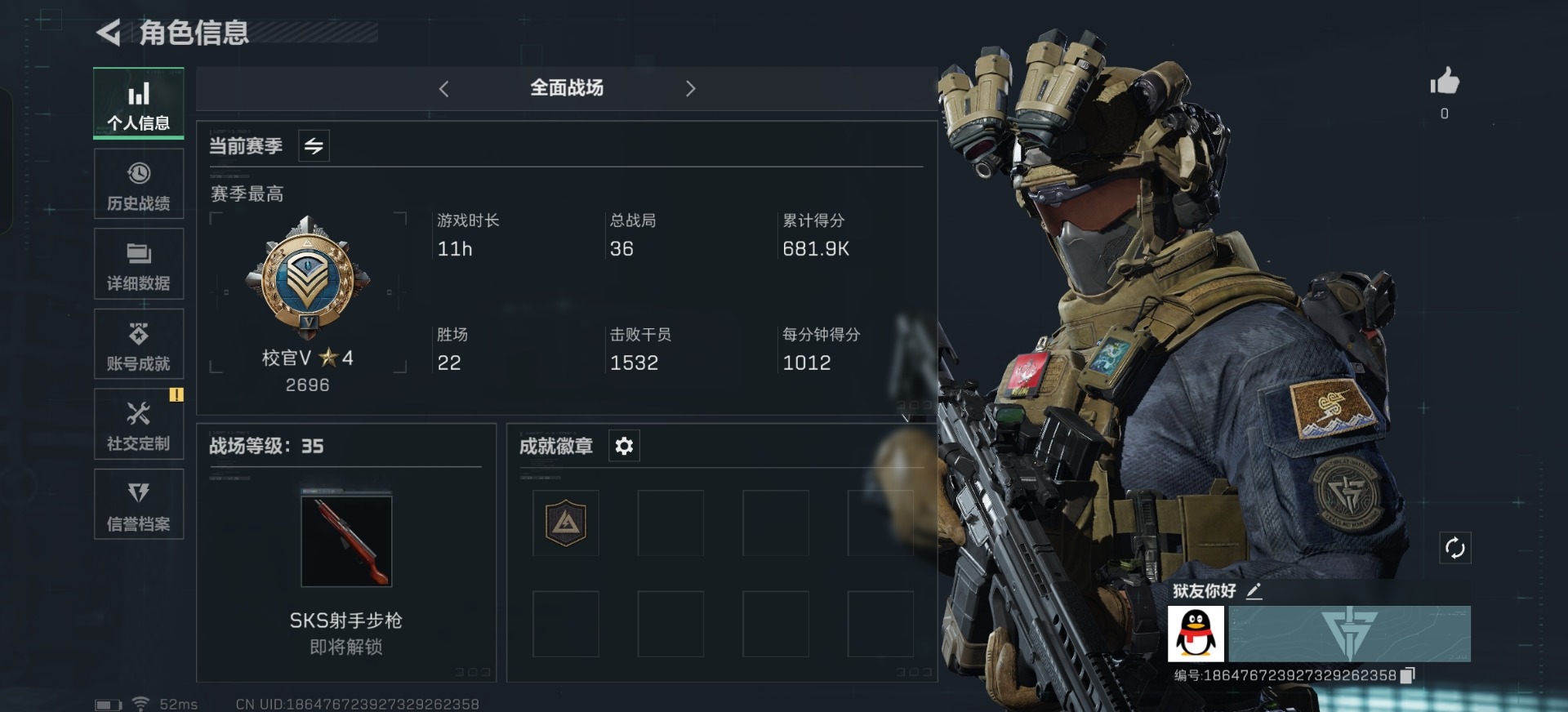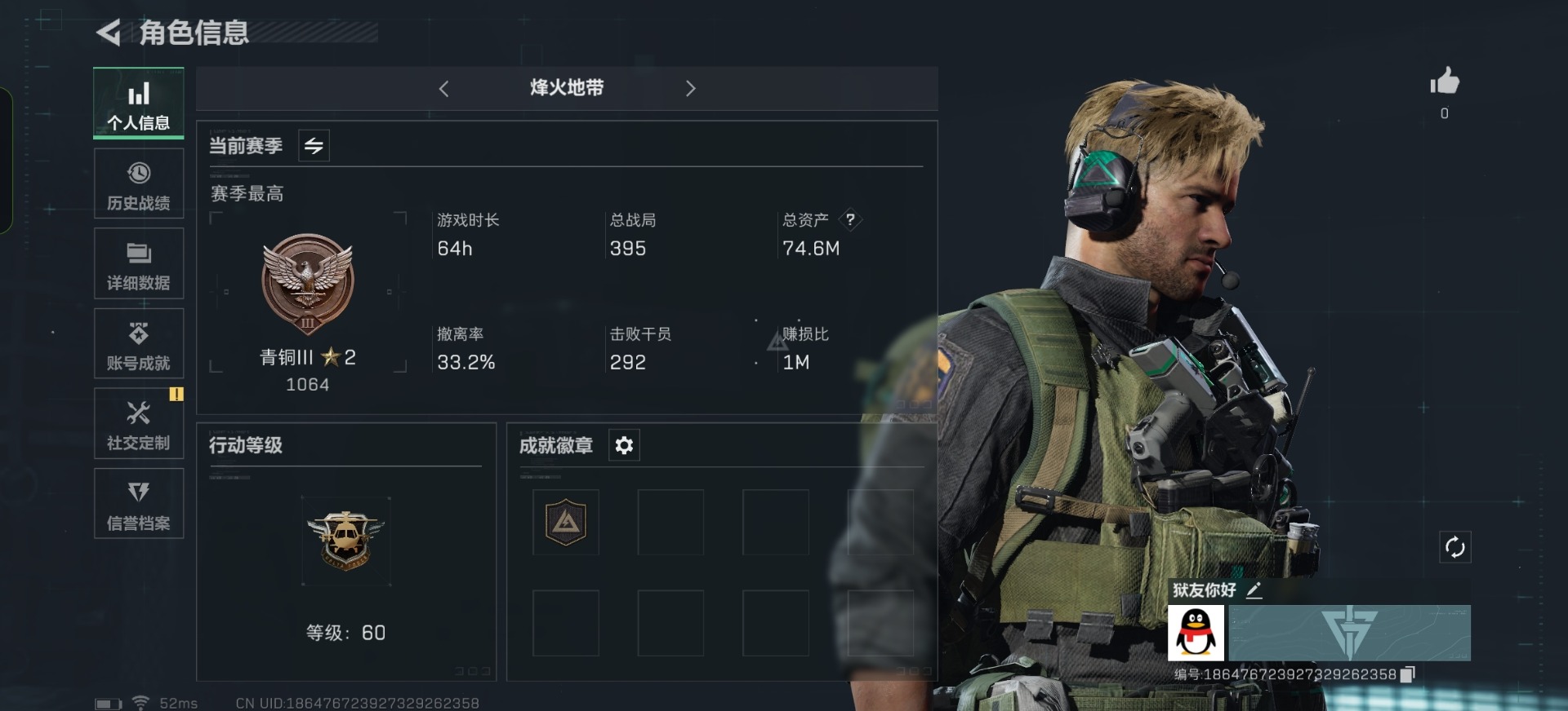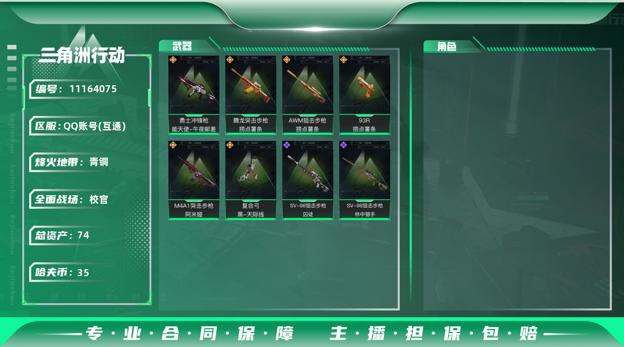 [11164075]总资产:74.6M 6传说枪械 哈夫币:35.123K 可二次 可修改实名 烽火地带段位:青铜 全面战场段位:校官 传说武器皮肤:勇士冲锋枪-能天使-午夜邮差,M4A1突击步枪-阿米娅,复合弓-黑-天际线,AWM狙击步枪-捞点薯条,腾龙突击步枪-捞点薯条,93R-捞点薯条 史诗武器皮肤:SV-98狙击步枪-林中猎手,SV-98狙击步枪-囚徒