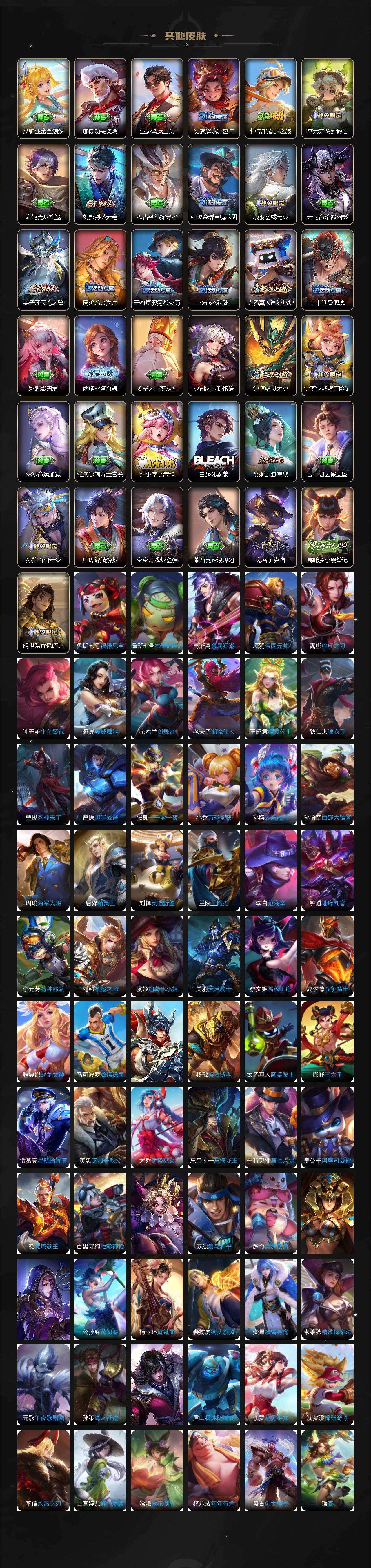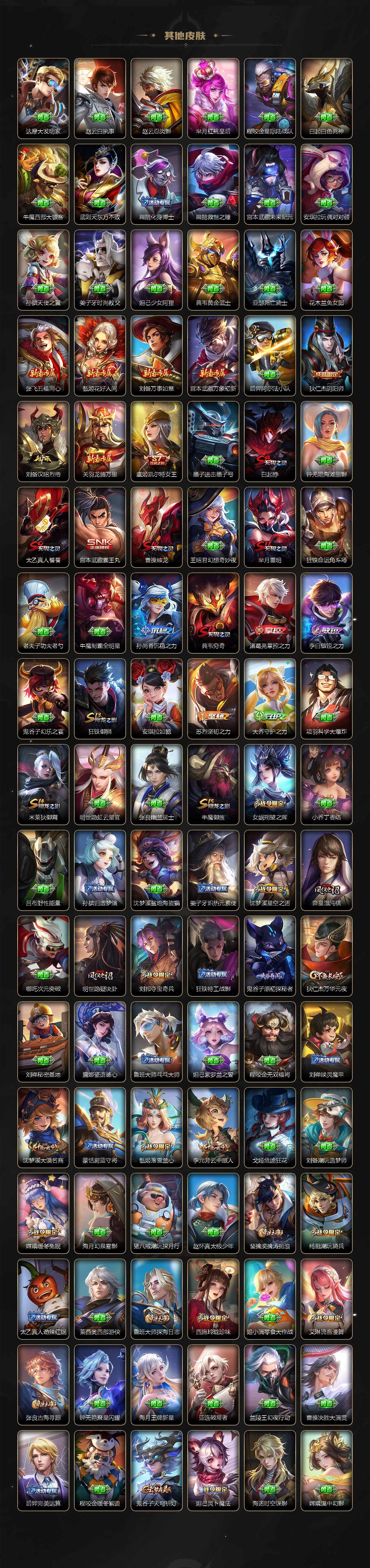 小乔青蛇,大乔白蛇,瑶遇见神鹿,伽罗箭羽风息,李元芳逐浪之夏,不知火舞魅语,大乔猫狗日记,孙策猫狗日记,阿轲节奏热浪,露娜紫霞仙子,诸葛亮黄金分割率,王昭君偶像歌手,韩信白龙吟,项羽苍穹之光,雅典娜冰冠公主,吕布末日机甲,鲁班七号电玩小子,橘右京修罗,嬴政摇滚巨星,刘禅绅士熊喵,刘禅天才门将,白起星夜王子,安琪拉心灵骇客,程咬金功夫厨神,刘邦德古拉伯爵,兰陵王暗隐猎兽者,曹操幽灵船长,宫本武藏鬼剑武藏,司马懿暗渊魔法,亚瑟心灵战警,钟馗乐园奇幻夜,杨戬天秀·启明,蔡文姬舞动绿茵,廉颇地狱岩魂,小乔缤纷独角兽,夏侯惇乘风破浪,花木兰水晶猎龙者,铠曙光守护者,墨子金属风暴,百里玄策原初追逐者,吕布圣诞狂欢,貂蝉圣诞恋歌,百里守约特工魅影,嬴政暗夜贵公子,嫦娥拒霜思,李白千年之狐,澜赏金猎手,庄周天秀·幻梦,蒙犽百解令,高渐离燃音魔法,伽罗琥珀纪元,大乔乘龙·忆丹青,安琪拉乘龙·聚宝船,赵怀真器灵·浮梦炉