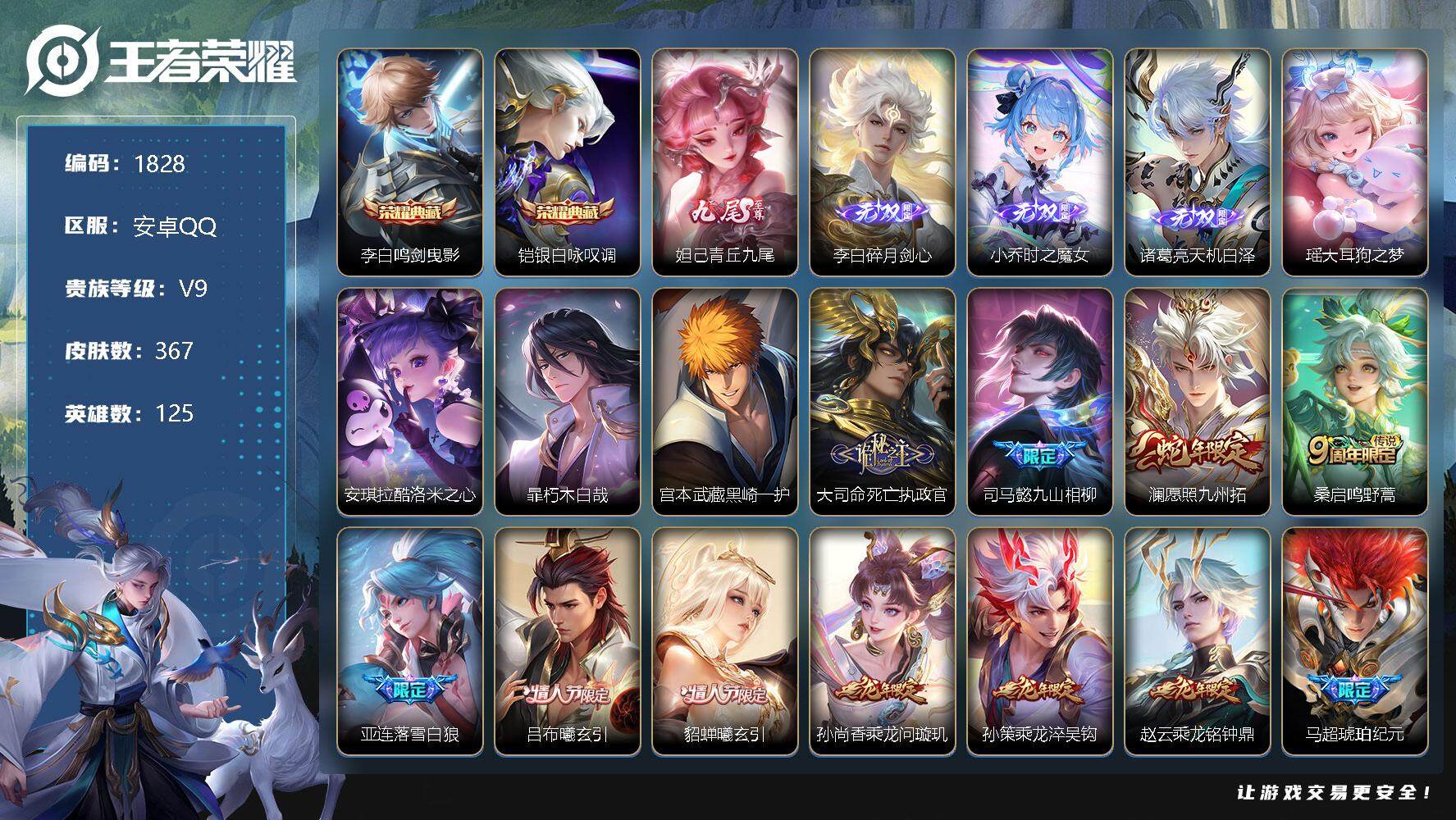 [12308203]【商品标题】:安卓Q-V9-永恒钻石II段位-125英雄-367皮肤-2典藏-0珍品无双-4无双-4珍品传说-29传说-103史诗 【英雄全皮】:司马懿全皮,鬼谷子全皮,空空儿全皮,影全皮 【荣耀典藏】:李白鸣剑曳影,铠银白咏叹调 【无双皮肤】:妲己青丘九尾,李白碎月剑心,小乔时之魔女,诸葛亮天机白泽 【珍品传说】:瑶大耳狗之梦,安琪拉酷洛米之心,暃朽木白哉,宫本武藏黑崎一护 【传说皮肤】:大司命死亡执政官,司马懿九山相柳,澜愿照九州拓,桑启鸣野蒿,亚连落雪白狼,吕布曦玄引,貂蝉曦玄引,孙尚香乘龙问璇玑,孙策乘龙淬吴钩,赵云乘龙铭钟鼎,马超琥珀纪元,铠琥珀纪元,鲁班七号时之奇旅,李白诗剑行,蔡文姬花朝如约,鲁班七号寅虎瑞焰,赵云淬星耀世,周瑜音你心动,李元芳飞鸢探春,镜炽阳神光,虞姬启明星使,李信一念神魔,貂蝉猫影幻舞,诸葛亮武陵仙君,李白凤求凰,孙尚香末日机甲,孙悟空地狱火,吕布天魔缭乱,狄仁杰超时空战士 【限定皮肤】:白起狰,姜子牙天穹之誓,狄仁杰阴阳师,虞姬凯尔特女王,赵云皇家上将,墨子降魔,鲁班七号寅虎瑞焰,鲁班七号时之奇旅,庄周高山流水,钟无艳超时空战士,孙膑寅虎展翼,芈月重明,吕布天魔缭乱,元歌云间偶戏,元歌无心,夏侯惇匿光决锋者,甄姬游园惊梦,甄姬落雪兰心,曹操烛龙,典韦穷奇,典韦岱宗,狄仁杰魔术师,狄仁杰万华元夜,项羽海滩派对,关羽冰锋战神,刘邦夺宝奇兵,韩信逐梦之影,韩信飞衡,孙悟空至尊宝,孙悟空大圣娶亲,孙悟空孙行者,牛魔御旌,后羿辉光之辰,李元芳银河之约,李元芳云中旅人,虞姬霸王别姬,虞姬启明星使,杨玉环遇见飞天,杨戬潮玩骑兵,女娲朔望之晖,太乙真人饕餮,鬼谷子原初探秘者,鬼谷子五谷丰年,诸葛亮武陵仙君,黄忠烈魂,百里玄策原初追逐者,弈星混沌棋,梦奇顽趣,沈梦溪星空之诺,沈梦溪大漠名商,明世隐疑决卦,裴擒虎擒涛扼浪,狂铁御狮,米莱狄御霄,云中君纤云弄巧,上官婉儿神器万象笔,嫦娥拒霜思,嫦娥暖冬兔眠,西施玲珑珍味,鲁班大师探海日志,艾琳流音漫舞,司空震地狱燃心,阿古朵江河有灵,张良古海寻踪,蒙犽百解令,高渐离燃音魔法,妲己灵卜魔法,鬼谷子天穹祈灯,李白碎月剑心,伽罗琥珀纪元,铠琥珀纪元,马超琥珀纪元,小乔时之魔女,大乔乘龙忆丹青,安琪拉乘龙聚宝船,孙尚香乘龙问璇玑,孙策乘龙淬吴钩,赵云乘龙铭钟鼎,吕布曦玄引,貂蝉曦玄引,百里玄策超元猎域,亚连落