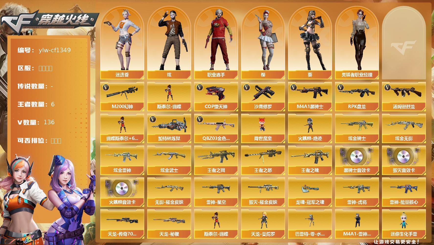 [12308348]【商品标题】:福建一区-136V-6王者-4炫金 【热门武器】:QBZ03-金色蔷薇,M200-幻神,M4A1-黑骑士,汤姆逊-烈龙*7,RPK-盘龙*6,加特林-炼狱*8,斯泰尔-蝴蝶,降世魔童,火麒麟-绝迹,COP-堕天神,沙鹰-修罗*3 【王者炫金武器】:炫金骑士,炫金无影,炫金雷神,炫金武士,王者之戮,王者之怒,王者之魄 【音效卡】:AK47-火麒麟音效卡,M4A1-黑骑士音效卡,Barrett-毁灭音效卡 【稀有皮肤】:雷神-能量核心,雷神-星空,雷神-虎将,毁灭耀金皮肤,天龙-秘银,AWM-天龙-传奇70KG,无影耀金皮肤,龙啸-冠军之啸 【角色】:灵狐者-职业经理,葵,樱,炫,迷迭香,职业选手 【人偶武器】:降世魔童,火麒麟-绝迹,斯泰尔-蝴蝶,天龙-曼陀罗,巴雷特-零-水下丽影,M4A1-雷神-精英刀锋,迷你生化手雷,闪光弹-小乔*2 【暴走生化】:斯泰尔-蝴蝶 【挑战大师】:神圣爆裂者III,阐释者III,激光毁灭者III*2 【英雄级武器】:M4A1-堕天神,COP-堕天神,麒麟刺-堕天神*2,龙啸-堕天神,斩神刀-雷暴,M4A1-雷霆,QBZ03-金色蔷薇,M4A1-雷神*2,M4A1-黑龙*2,M4A1-玫瑰精灵,M4A1-黑骑士,M4A1-死神*2,RPK-盘龙*6,加特林-炼狱*8,汤姆逊-烈龙*7,AK47-无影,AK47-火麒麟*2,AK47-黑武士*2,AK12-天启*3,AWM-天龙,Barrett-毁灭*5,Barrett-极光,AWM-裁决,M4A1-龙血*2,AA-12-雷霆,M200-幻神,AK47-黑鲨*2,M4A1-千变*2,黑武士-锦绣游龙,AK-47-猩红传说*2,AK47-B-战神,AK47-B-常胜将军,沙鹰-天神*3,沙鹰-修罗*3,麒麟刺*2,擎天*2,龙啸*2,屠龙*3 【特殊枪械】:蝴蝶斯泰尔+6烈龙,1黑骑士,6烈龙,6盘龙,6炼狱,1蝴蝶斯泰尔