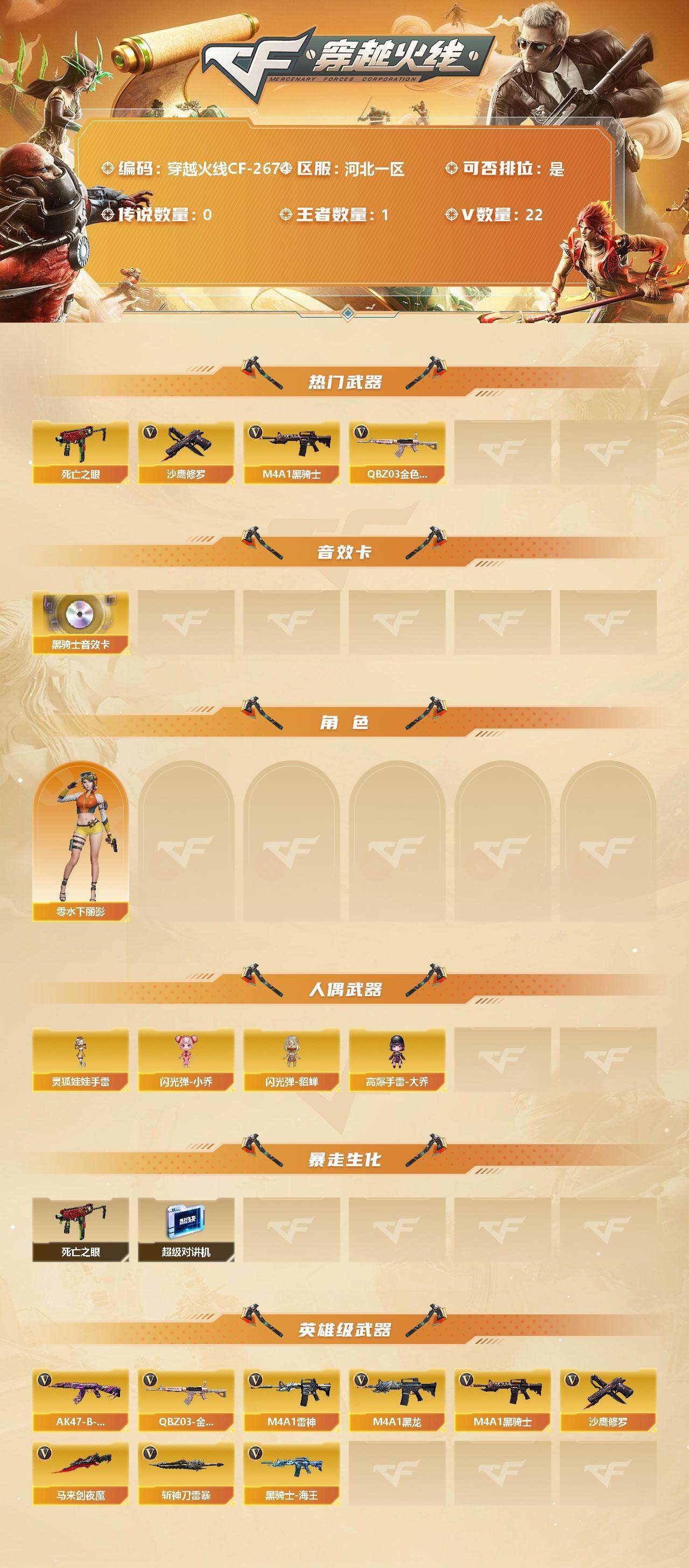 [12308542]【商品标题】:河北一区-22V-1王者-0炫金 【热门武器】:QBZ03-金色蔷薇,死亡之眼*2,M4A1-黑骑士,沙鹰-修罗*2 【音效卡】:M4A1-黑骑士音效卡 【角色】:零-水下丽影 【人偶武器】:灵狐娃娃手雷,闪光弹-小乔,闪光弹-貂蝉,高爆手雷-大乔 【暴走生化】:死亡之眼*2,超级对讲机 【英雄级武器】:马来剑-夜魔,斩神刀-雷暴,QBZ03-金色蔷薇,M4A1-雷神,M4A1-黑龙,M4A1-黑骑士,黑骑士-海王*3,AK47-B-常胜将军,沙鹰-修罗*2 【特殊枪械】:1黑骑士