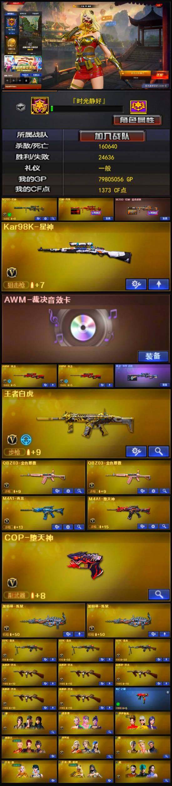 【热门武器】:QBZ03-金色蔷薇*2,M4A1-青龙,M200-幻神,金色蔷薇-古蛇迷踪,修罗-古蛇迷踪,死亡之眼,Kar98K-星神,金色小号,M4A1-黑骑士*5,汤姆逊-烈龙*5,RPK-盘龙*3,加特林-炼狱*2,羊驼玩偶,降世魔童,COP-堕天神,沙鹰-修罗*7