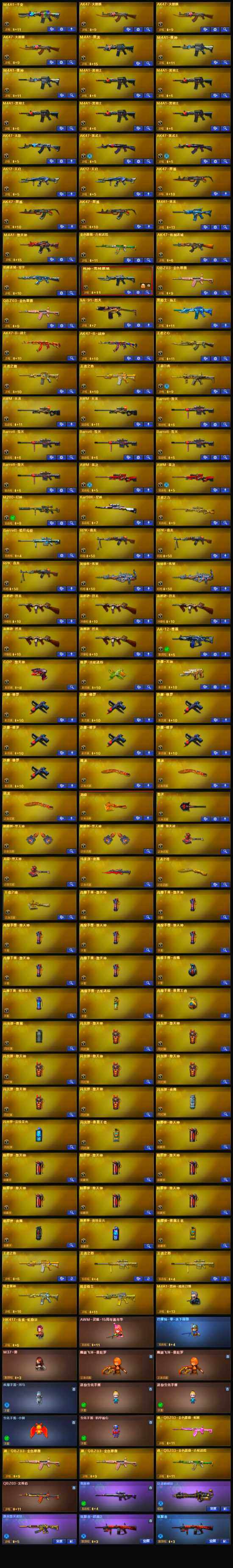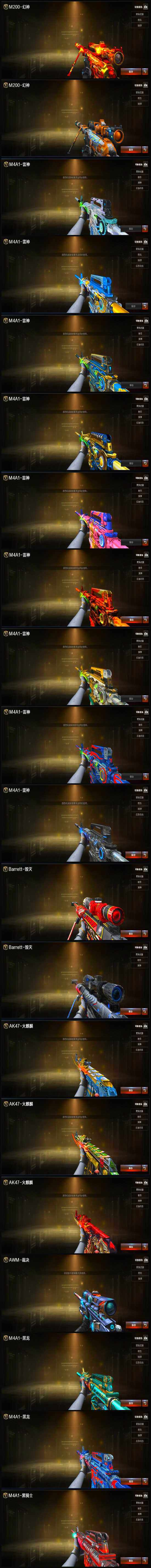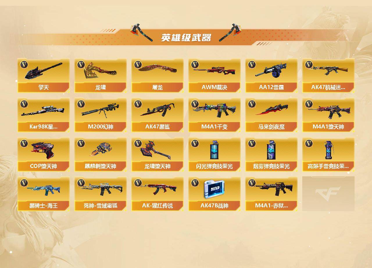 【英雄级武器】:高爆手雷-竞技荣光,烟雾弹-竞技荣光,闪光弹-竞技荣光,马来剑-夜魔,M4A1-堕天神,COP-堕天神,麒麟刺-堕天神*2,龙啸-堕天神*2,QBZ03-金色蔷薇*2,M4A1-青龙,金色蔷薇-古蛇迷踪,M4A1-雷神*2,M4A1-黑龙,M4A1-黑骑士*5,RPK-盘龙*3,加特林-炼狱*2,汤姆逊-烈龙*5,AK47-无影,AK47-火麒麟*3,AK47-黑武士*2,AK12-天启*2,AWM-天龙*2,Barrett-毁灭*5,AWM-裁决*2,AK47-机械迷城,AA-12-雷霆,Kar98K-星神,M200-幻神,AK47-黑鲨*3,M4A1-千变,黑骑士-海王,死神-雪域霜狐,AK-47-猩红传说*2,AK47-B-战神,M4A1-赤狱骑士,修罗-古蛇迷踪,沙鹰-天神,沙