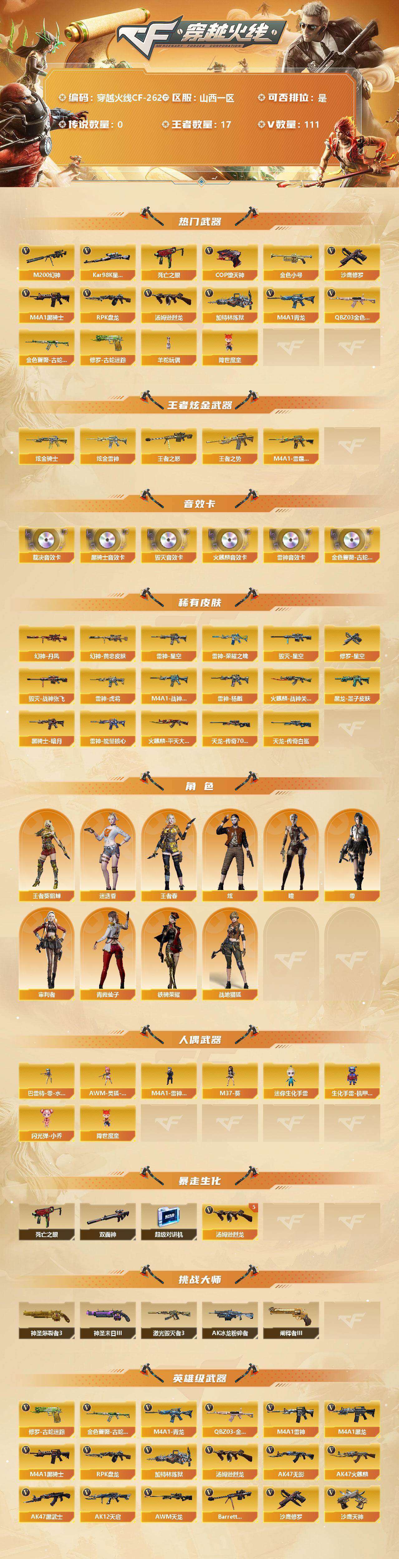 [12308504]【商品标题】:山西一区-111V-17王者-2炫金 【热门武器】:QBZ03-金色蔷薇*2,M4A1-青龙,M200-幻神,金色蔷薇-古蛇迷踪,修罗-古蛇迷踪,死亡之眼,Kar98K-星神,金色小号,M4A1-黑骑士*5,汤姆逊-烈龙*5,RPK-盘龙*3,加特林-炼狱*2,羊驼玩偶,降世魔童,COP-堕天神,沙鹰-修罗*7 【王者炫金武器】:炫金骑士,炫金雷神,王者之势,王者之怒*2,M4A1-雷霆王者 【音效卡】:AK47-火麒麟音效卡,M4A1-雷神音效卡,M4A1-黑骑士音效卡,Barrett-毁灭音效卡,QBZ03-金色蔷薇-古蛇迷踪音效卡,AWM-裁决音效卡 【稀有皮肤】:M200-幻神-黄忠皮肤,幻神-丹凤,雷神-能量核心,雷神-荣耀之魄,雷神-星空,雷神-虎将,M4A1-战神赵云,雷神-杨戬,火麒麟-战神关羽,火麒麟-平天大圣,黑骑士-暗月,黑龙-墨子皮肤,毁灭-星空,毁灭-战神张飞,AWM-天龙-传奇70KG,AWM-天龙-传奇白鲨,修罗-星空 【角色】:王者-葵-貂蝉,王者春,审判者,零,瞳,炫,迷迭香,战地猎狐,铁骑荣耀,青霞仙子 【人偶武器】:降世魔童,巴雷特-零-水下丽影,AWM-灵狐-15周年嘉年华,M4A1-雷神-精英刀锋,M37-葵,迷你生化手雷*2,生化手雷-机甲核心,闪光弹-小乔 【暴走生化】:死亡之眼,双面神,超级对讲机 【挑战大师】:神圣爆裂者III,神圣爆裂者-末日III,阐释者III,激光毁灭者III,AK47-冰龙粉碎者 【英雄级武器】:高爆手雷-竞技荣光,烟雾弹-竞技荣光,闪光弹-竞技荣光,马来剑-夜魔,M4A1-堕天神,COP-堕天神,麒麟刺-堕天神*2,龙啸-堕天神*2,QBZ03-金色蔷薇*2,M4A1-青龙,金色蔷薇-古蛇迷踪,M4A1-雷神*2,M4A1-黑龙,M4A1-黑骑士*5,RPK-盘龙*3,加特林-炼狱*2,汤姆逊-烈龙*5,AK47-无影,AK47-火麒麟*3,AK47-黑武士*2,AK12-天启*2,AWM-天龙*2,Barrett-毁灭*5,AWM-裁决*2,AK47-机械迷城,AA-12-雷霆,Kar98K-星神,M200-幻神,AK47-黑鲨*3,M4A1-千变,黑骑士-海王,死神-雪域霜狐,AK-47-猩红传说*2,AK47-B-战神,M4A1-赤狱骑士,修罗-古蛇迷踪,沙鹰-天神,沙