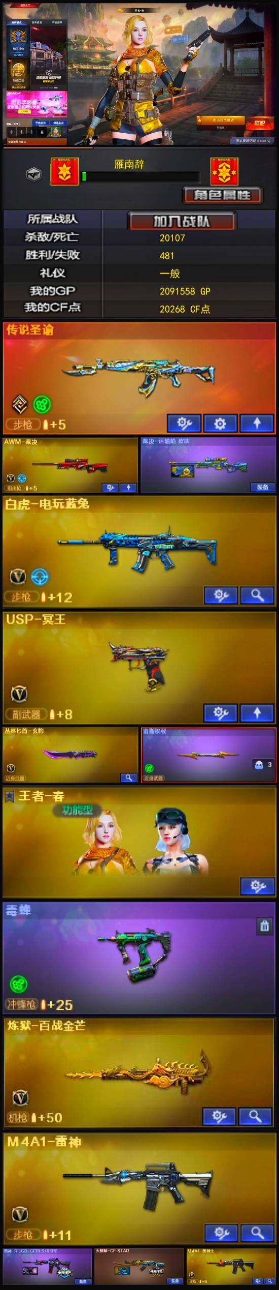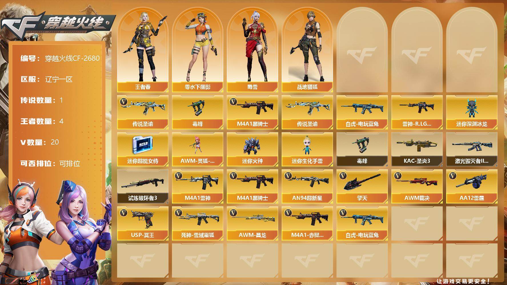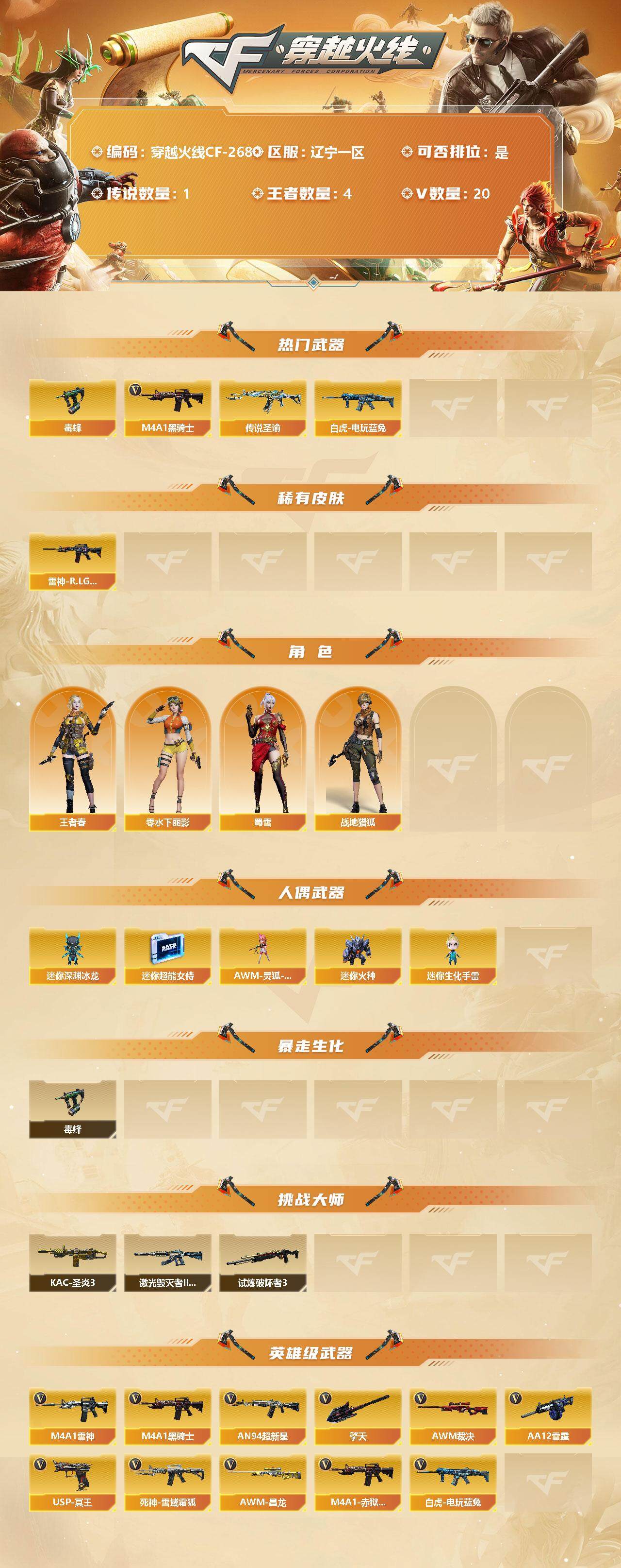 [12308562]【商品标题】:辽宁一区-20V-4王者-0炫金 【传说武器】:传说圣谕 【热门武器】:传说圣谕,白虎-电玩蓝兔,毒蜂,M4A1-黑骑士 【稀有皮肤】:雷神-R.LGD-CFPLS18冠军 【角色】:王者春,零-水下丽影,战地猎狐,蜀雪 【人偶武器】:AWM-灵狐-15周年嘉年华,迷你深渊冰龙*3,迷你超能女侍,迷你火种,迷你生化手雷 【暴走生化】:毒蜂 【挑战大师】:KAC-圣炎切割者III,试炼破坏者III,激光毁灭者III-白马银枪 【英雄级武器】:白虎-电玩蓝兔,M4A1-雷神,M4A1-黑骑士,AN94-超新星,AWM-裁决,AA-12-雷霆,死神-雪域霜狐,AWM-昌龙,M4A1-赤狱骑士,USP-冥王,擎天 【特殊枪械】:1黑骑士