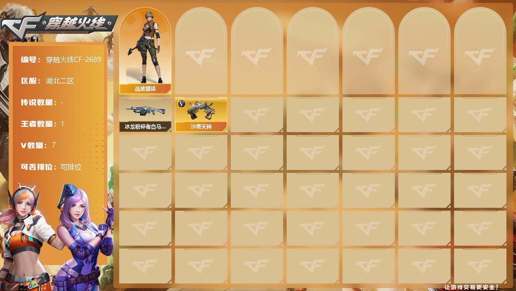 [12308610]【商品标题】:湖北二区-7V-1王者-0炫金 【角色】:战地猎狐 【挑战大师】:冰龙粉碎者-白马银枪 【英雄级武器】:沙鹰-天神 【特殊枪械】: